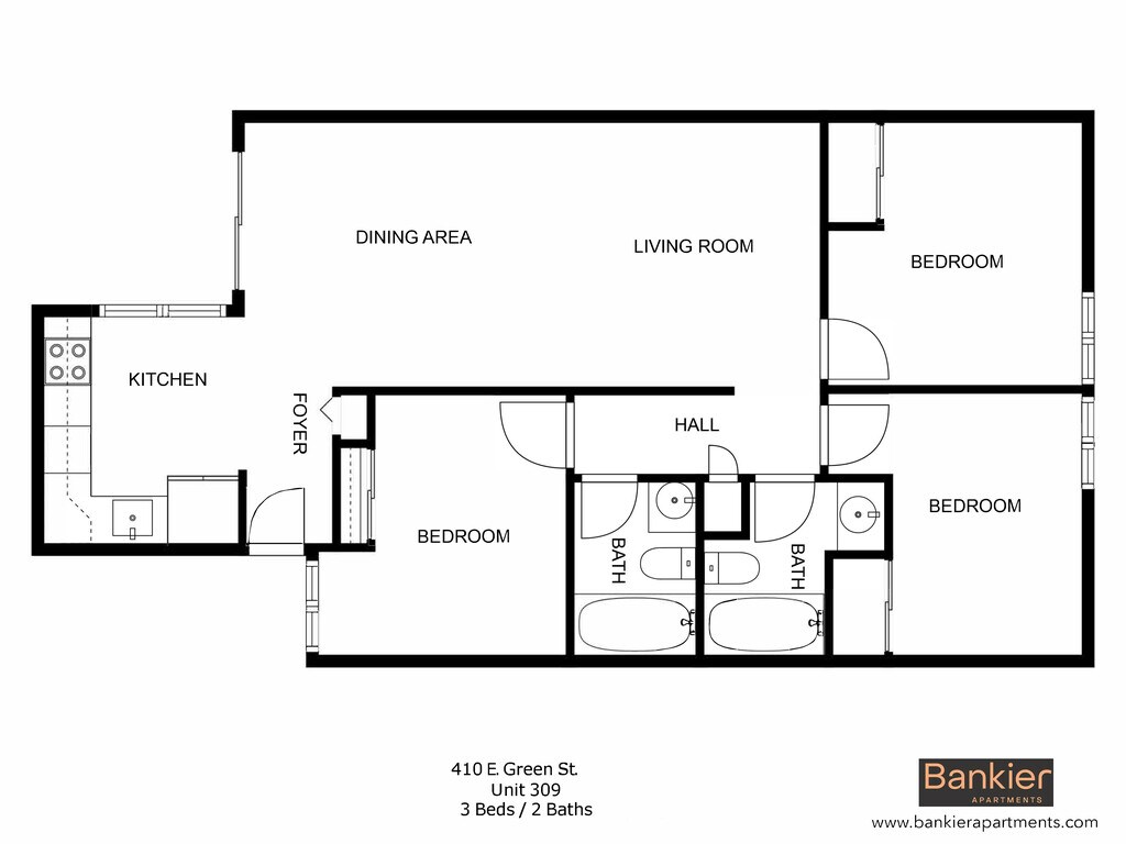 410 E. Green St by Bankier Apartments offers Studio to 3 Bedroom apartments starting from $875 and having 445–1,050 sq ft. Here is the current pricing and availability: