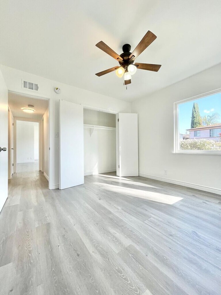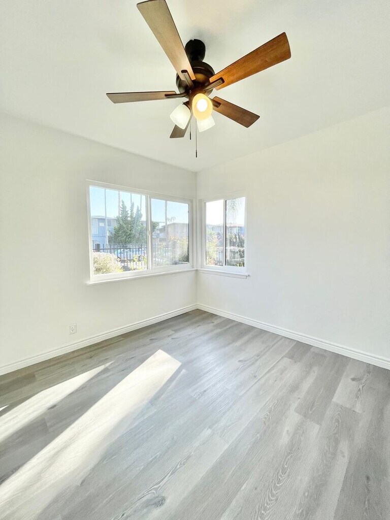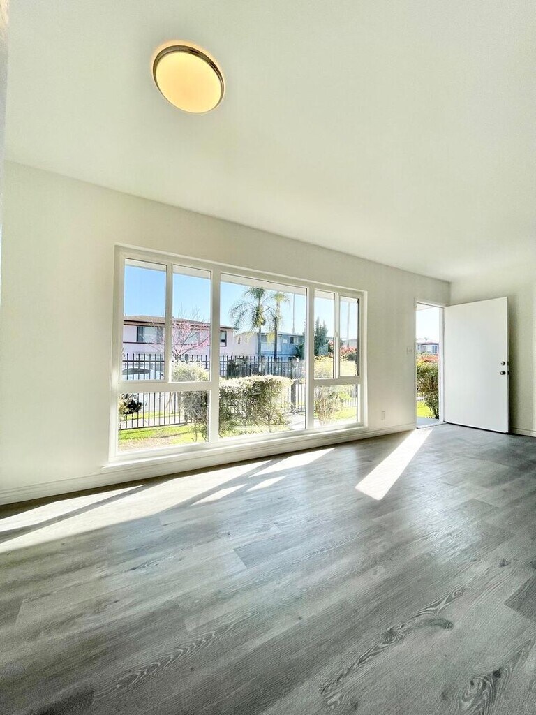 2-bedroom, 1-bath ground floor apartment with 819 sq ft of living space. The unit features wood-style flooring, white vinyl windows, and a remodeled kitchen/bathroom with stainless steel appliances including stove/oven and refrigerator. – Ground floor unit – One block from Kaiser Permanente – Owner pays water, sewer, and trash – On-site laundry facilities – Pet friendly (cats allowed, small dogs considered) – Online rent payment and maintenance portal – Street parking only – Central heat Section 8 welcome.