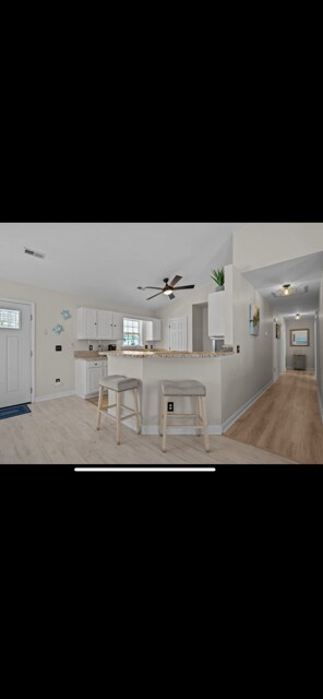 Welcome home to this fully furnished 3 bedroom, 2 full bathroom Carolina Beach attached townhome available for long-term rent! Situated in a quiet neighborhood just blocks away from the ocean, greenway trails and schools, this spacious townhome offers an open floor plan and ample parking space. The light and bright interior exudes coastal charm, plus a huge screened-in patio on the lower level with attached 2-car parking area, as well as a shared backyard with fire pit area and oversized storage room that could easily be used as a workshop. Small/medium sized dog allowed with dog fee.