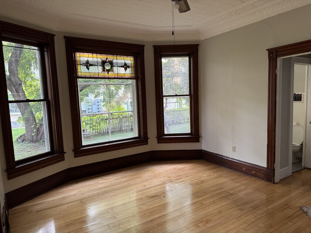 ?This is a spacious 3 bedroom lower unit in a beautiful, historic duplex setting. The unit has wood floors, updated bathroom flooring, coin operated laundry, and street parking. Tenants takes care of all utilities, lawn care and snow removal. PETS: NO PETS