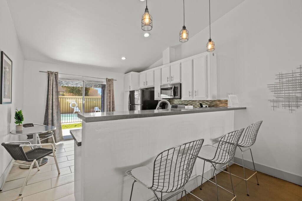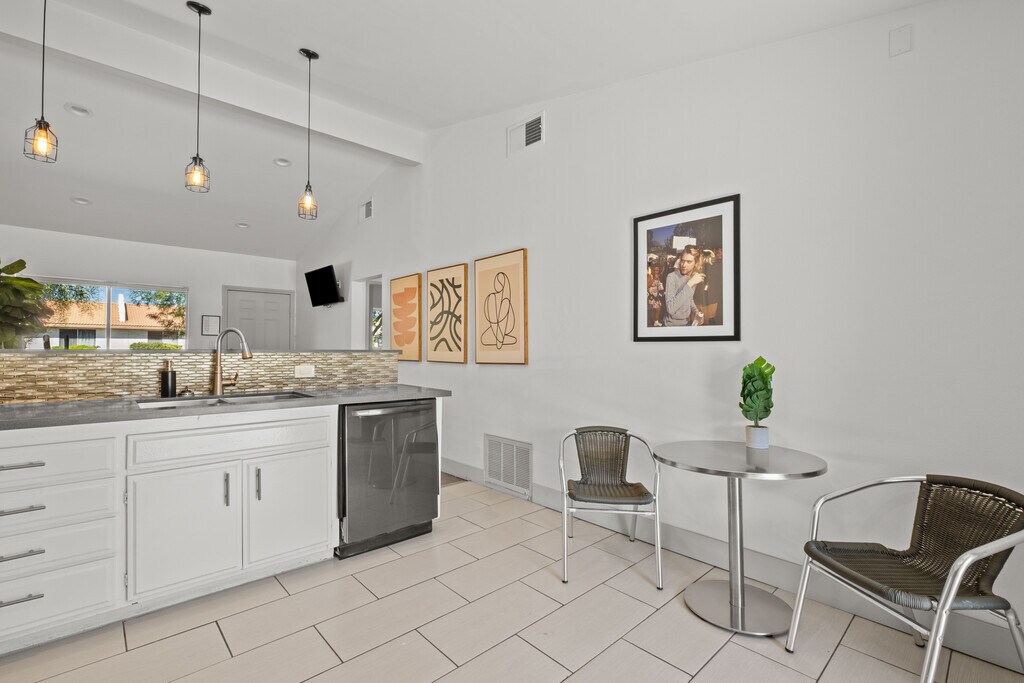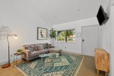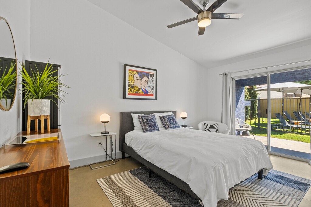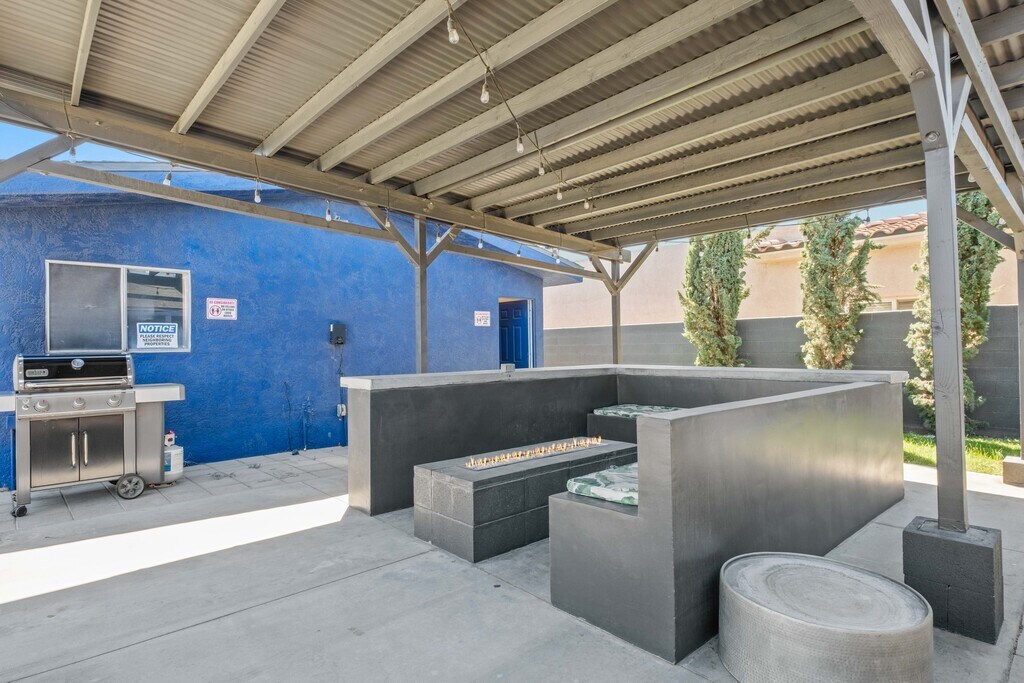 This apartment is part of an amazing triplex, located near Bermuda Dunes airport and Country Club with easy access to everything great that the Greater Palm Desert area has to offer. It's also close to schools, restaurants and retail amenities. The apartment is a 2 bedroom, 1 bathroom single level unit. The living room has a cathedral ceiling opening to a modern kitchen. There is a private patio space with easy access to the sparkling pool, barbecue area, and fire pit lounge area. The unit has polished floors concrete floors, central air conditioning, upgraded kitchen with quartz countertops and stainless steel appliances. There is a common laundry room outside. Two open parking spaces in the back of the property and ample street parking. Owner pays for water, trash, gardening and pool maintenance. Renter pays electricity and gas bills.