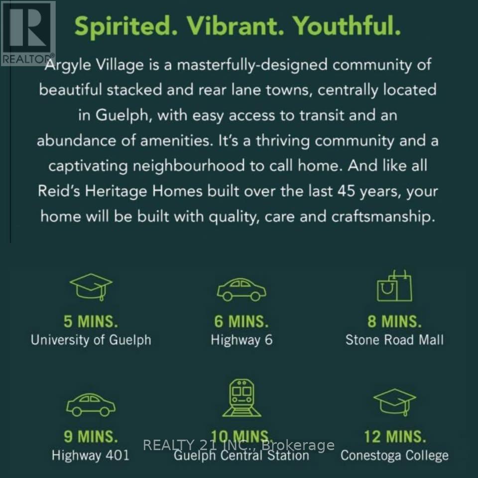 WOW! Brand new unit living in the heart of Guelph. Don't miss out on this opportunity to live in this 900 sq. ft.,2-bedroom,2-bath interior stacked townhome designed for comfort,efficiency and style. This brand-new home features a smart open-concept layout,stainless steel appliances,quartz countertops throughout,and refined finishes by renowned Reid's Heritage Homes. Enjoy the convenience of one dedicated parking space. Set in the heart of South Guelph,the location checks every box: walkable access to shopping,dining,fitness centres,parks and transit,plus quick connections to the Hanlon and Highway 401. Just minutes from University of Guelph,this is a high-demand area for students,faculty,and professionals alike. Nearby trails and green spaces add a welcome dose of nature to everyday life. Modern finishes,a practical layout,and a location that performs. This home is not completed yet. Earliest availability June 1st. Earliest visit to the property May 19th. (id:52069) ID#: 2146389