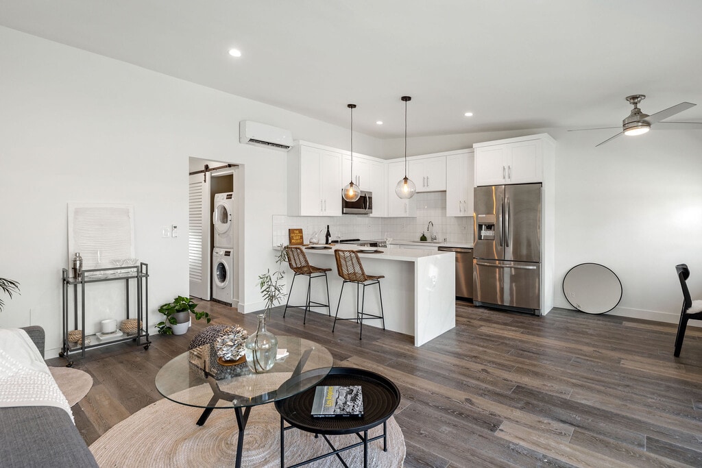 WASHER AND DRYER AND A.C. INCLUDED IN EACH UNIT! Exterior received a fresh and modern make over with: BRAND NEW Siding and Smooth Stucco, New Roof, New Windows, New BBQ and 2 Fire Pits, Lounge Chairs, and tables - perfect for entertaining! Brand New Large JACUZZI with Chaise Lounge Chairs and New landscaping! New Copper Plumbing and Some New Sewer Drain Lines! BRAND NEW Remodeled 2 Bedroom 2 Bathroom & 3 Bedroom 2 Bath apartment comes with: Shaker white cabinets in the kitchen and bathrooms, white quartz counters, tile floors in the bathroom, stylish wood laminate floors in the living room, kitchen & bedrooms, new SOAKING (DEEP) tub and wall tile, Recessed lighting, STAINLESS STEEL APPLIANCES (dishwasher, range, microwave & refrigerator), WASHER and DRYER in unit, AC in unit, fixtures and SMOOTH CEILINGS throughout! CONTROLLED ACCESS building with onsite manager. Right across the street from Freedom Park with walking trails. 1 parking spot included in a GATED tuck under parking. View pics of similar remodel.
