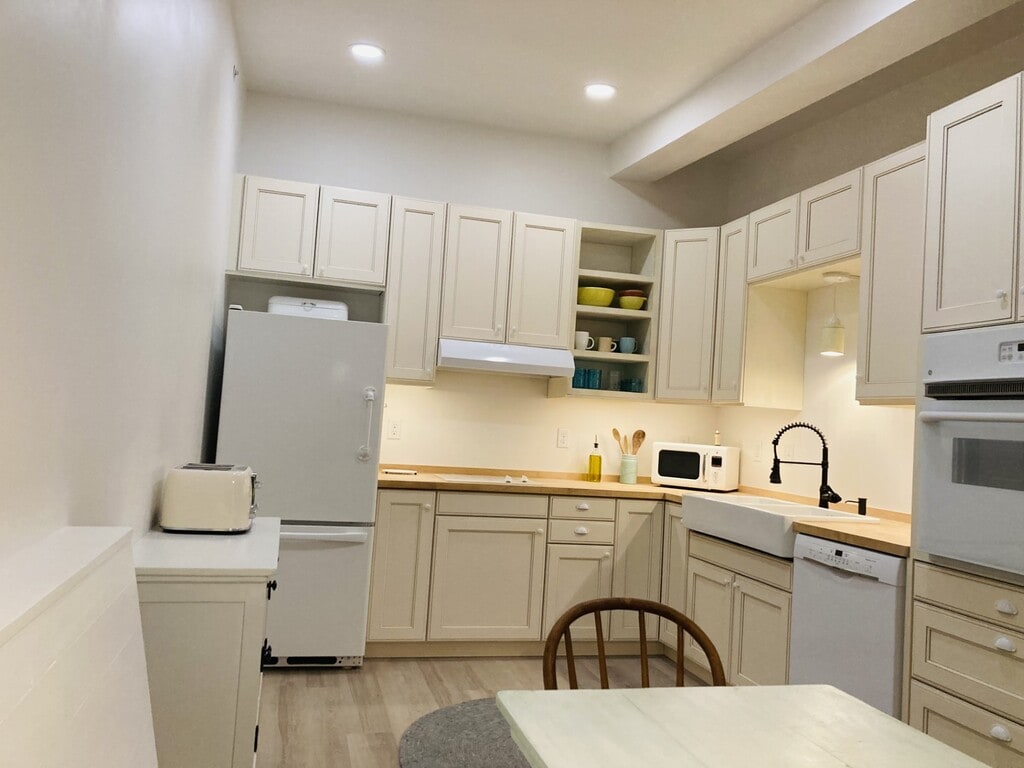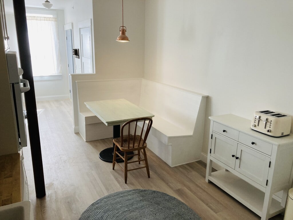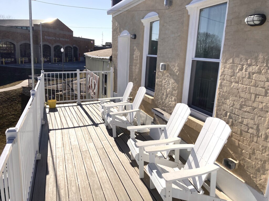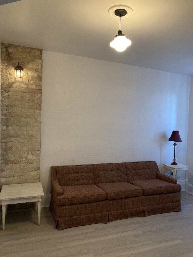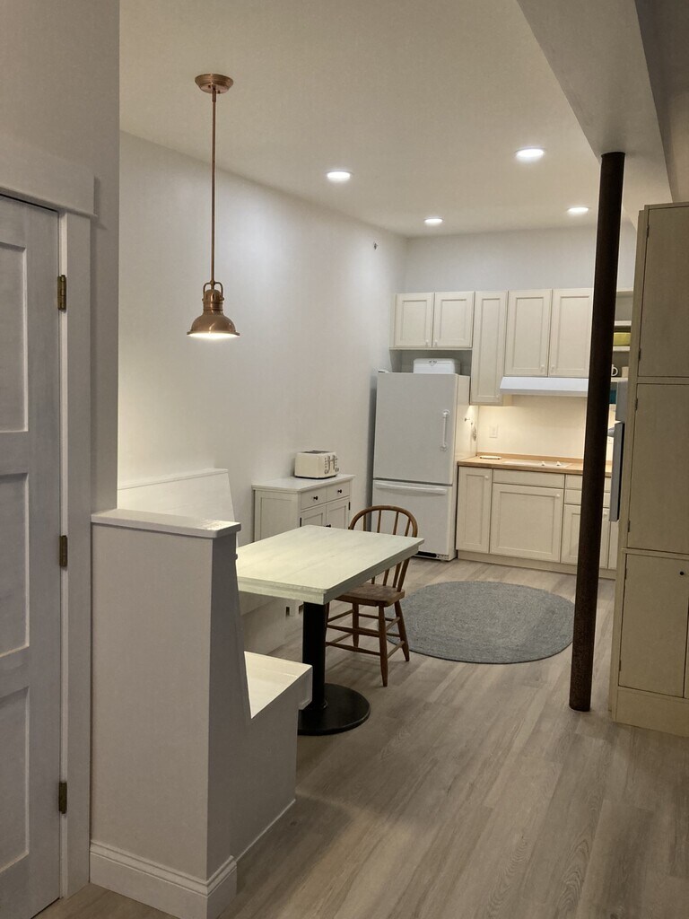 hey there. the rear 2-bedroom unit, on the second floor of my 130 yr-old main street building is available to rent as of november 1st! there are only 2 residential units in the building (with commercial space below). this is the south-facing one, so it gets a ton of cheery sunlight! (& is nice & quiet, since it's set back from main street.) there's a shared deck overlooking a quaint little city park w/ a pond & gazebo (that hosts live music on thursdays throughout summer) i hesitate to call them "luxury apartments"... but, hey; they are pretty well-appointed units-- only 1-year old, 2nd floor, european-modern (w/ "farmhouse" details:), in a rehabbed historical building, with a great view!? and you only have one neighbor. we tried to retain the integrity of the historic building (the hallway has exposed brick!) by using real wood trim & doors, for example... and then tried to apply a scandinavian sense of design by keeping things light and austere. unit B's kitchen boasts butcher-block countertops, soft-close cabinetry, a double basin "apron" sink, an (ergonomic) wall oven, undercabinet lighting (of course), a Bosch dishwasher & a built-in corner "booth" dining table! the second "bed room" probably feels more like a den/office, and lacks a closet (there are 2 closets in the spacious master). there's a cozy reading nook next to one of the four south-facing windows. we (consciously) chose to embrace the future, by not using gas appliances. (plus our roof is covered with solar panels:) so the hvac system uses "heat pump" technology. (instead of forced air through ducts, there are wall units that silently provide warm or cool air). then there's an induction cooktop & electric oven. but, guess what-- i will INCLUDE UTILITIES in the rent! (including internet). to sweeten the pot, there's a common space between units A & B. this common space contains a rec room (w/ a large TV & pub tables, etc.) AND a guest bedroom/bathroom (that either tenant can reserve when needed). this effectively expands the square-footage of your home , when you consider you have access to this shared space. laundry is in the back hall. there's even a small work-out room (& bumper pool room) in the basement you can use. the apartment is probably best suited to a couple, i'd say... based on the overall size of the rooms. oh yeah, there's no elevator in the building, so you have to be good with stairs. but the location is pretty ideal. a stone's throw from the opera house-- you'll be able to walk to all of the restaurants & shops that vibrant downtown stoughton has to offer! we love it here. sorry-- no pets:/