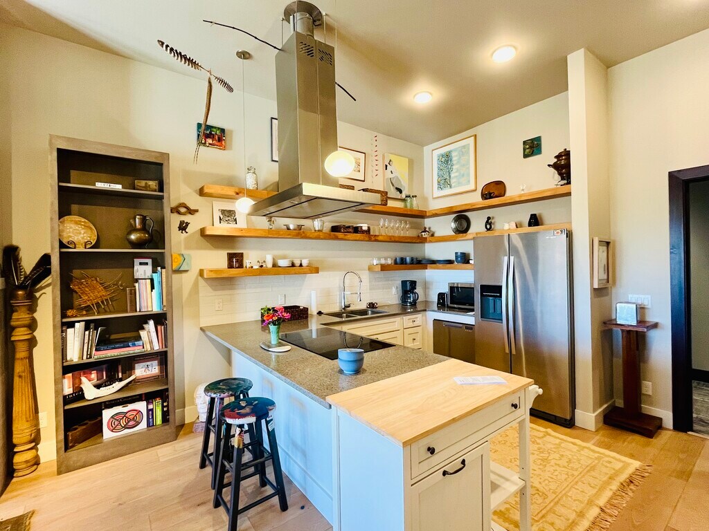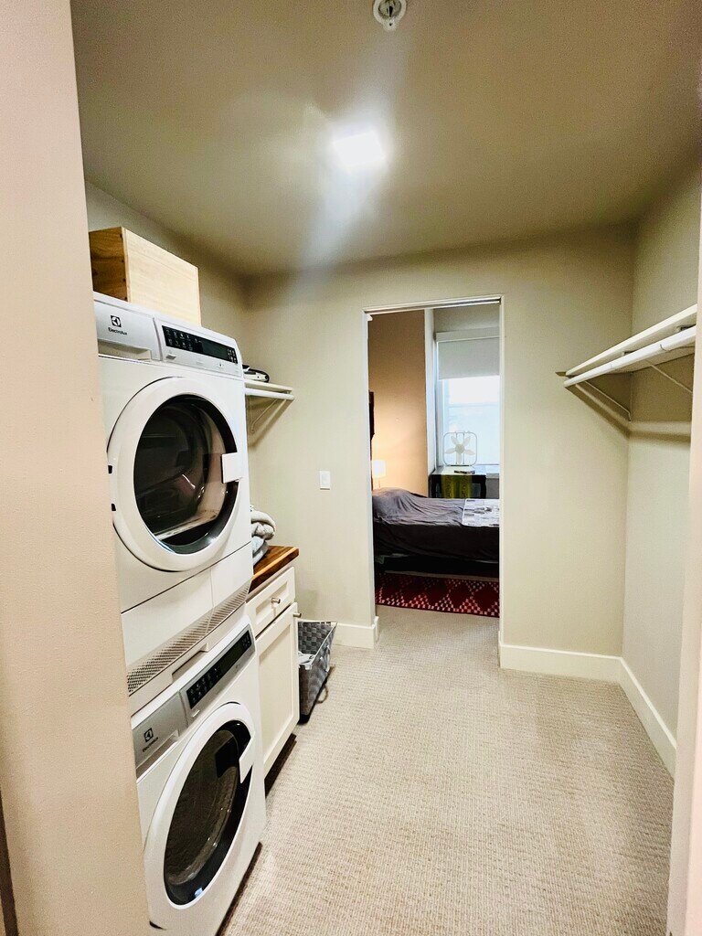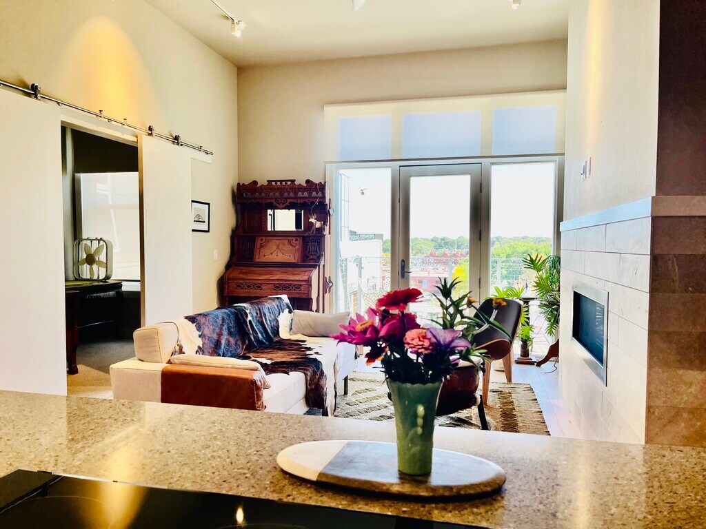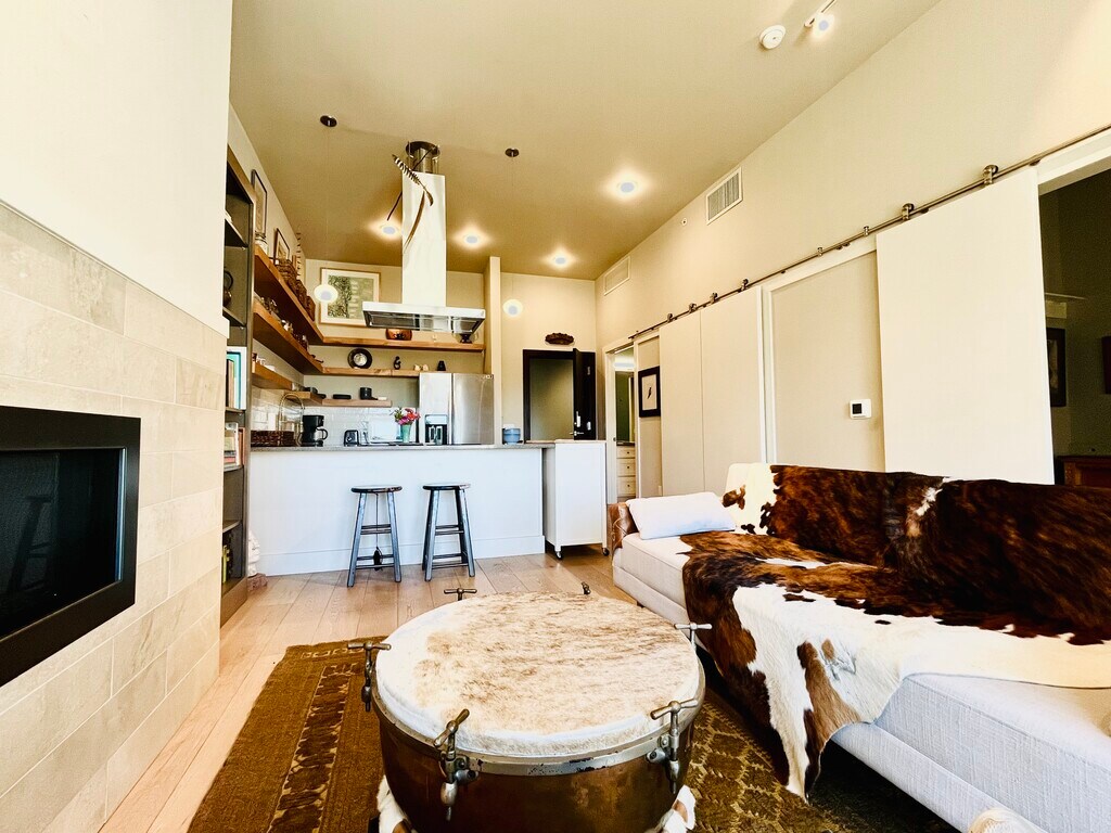 This sleek, compact space features effortless downtown living. The design, finishes and materials are high quality including 10' ceilings, wood floors, modern ss appliances including microwave, quartz counter top, washer/dryer, gas fireplace, double elevators, parking in basement accessed through the alley. Benefits of living at the Jones include Butterfly security system (phone app), fitness room, game room, access to first floor retail including a coffee shop, eateries, clothing stores and more not to mention music from the Levitt Pavilion across the street, and a great view from the 4th floor courtyard balcony. Parking included, all utilities/trash included except electricity (Xcel).
