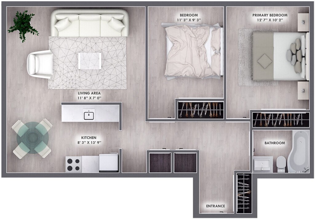 2 Beds, 1 Bath, 823 sq ftAvailable Apr 1Largest 2 BedroomThis is the largest 2 Bedroom at this PropertyModel Gallery