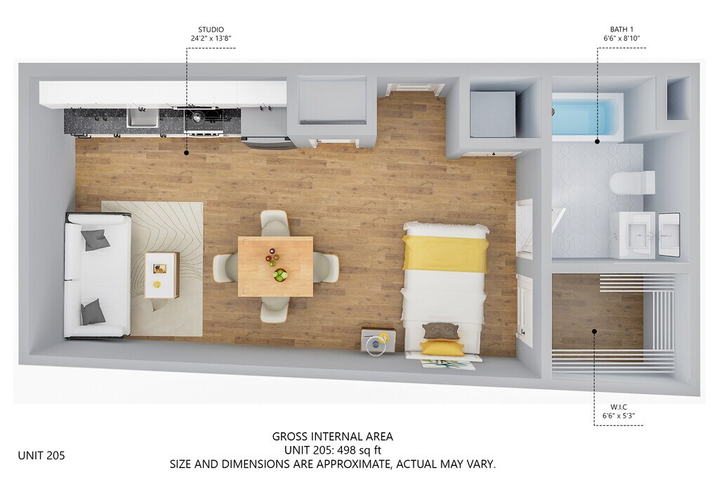 205 - Floorplan 1 Apartment Unit: 205Apartment Model: 205$1,095Studio, 1 Bath, 498 sq ftAvailable Now![]()