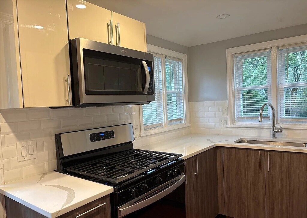 453 W Lancaster Ave, Haverford, PA 19041. Enjoy the perfect blend of historic charm and modern convenience in this beautifully renovated apartment. Located in the highly sought-after Lower Merion School District, this residence offers ample parking and is within walking distance to Haverford Friends School, Haverford College, scenic walking trails, the Bird Sanctuary, Merion Cricket Club, shopping, and restaurants. Step inside through the front entrance into a spacious living room featuring a cozy gas fireplace and generous closet space. The fully updated kitchen includes brand-new cabinets, marble countertops, and high-end stainless steel appliances, creating a perfect space for cooking and entertaining. The formal dining room opens to a private backyard, ideal for relaxing or outdoor dining. This home features 3 spacious bedrooms, 1 full bath, and 1 half bath, all recently renovated with elegant finishes. Beautiful hardwood floors flow throughout, and abundant closet space offers convenient storage. For added comfort, the apartment includes an in-unit washer and dryer. Available immediately. Utilities not included.