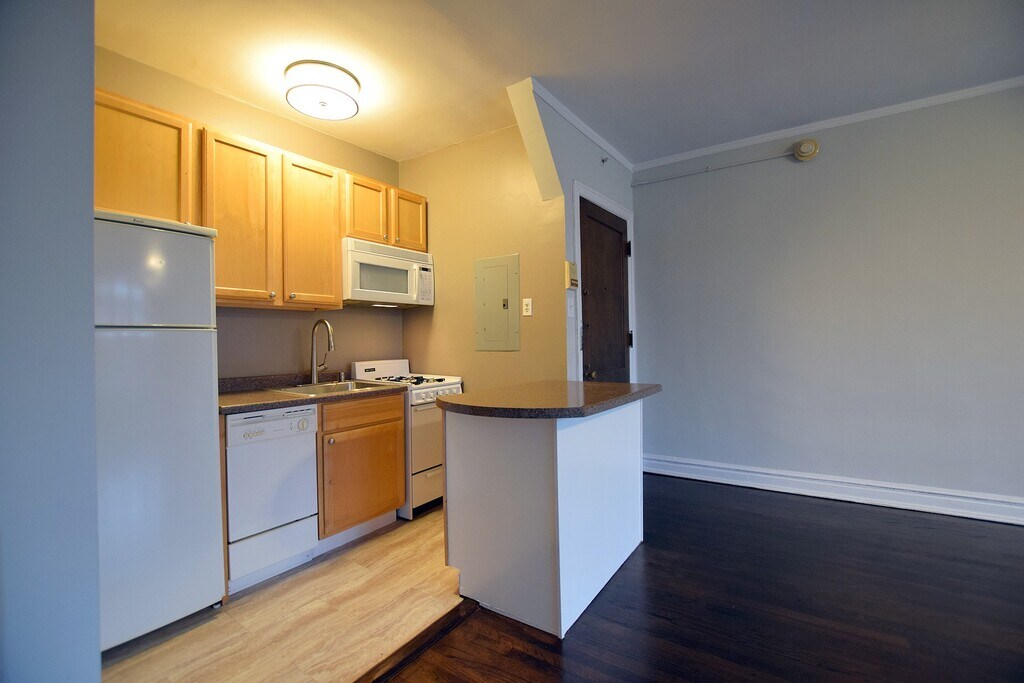 Renovated 1 bedroom in a well run vintage two story building! . Hardwood floors. Bright apartment w large picture windows, Eat in kitchen with dishwasher and microwave. Large bedroom (with closet) fitting for even a king size bed. Large bathroom. Heat and water included. Clean and tidy laundry room in building plus bike storage. Classic, original details combine with fresh updates to create happy home - all in an ideal location near schools, town, train, bike/walking path and Lake Michigan! Available immediately. Owner pays for heat, water and disposal. Tenant pays for cooking gas and electric.
