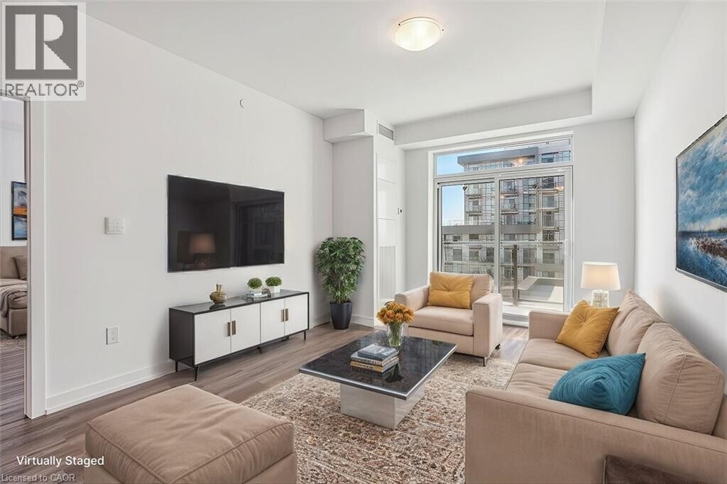 Stunning unit in the sought-after Trend 2 building in Waterdown offering 792 sq ft of well-designed living space and the rare bonus of two designated underground parking spaces. Featuring 9 ft ceilings and an open-concept layout,this 1 bedroom unit includes a floor-to-ceiling window and a versatile den ideal for a home office. The modern kitchen offers stainless steel appliances including a built-in microwave,breakfast bar seating,upgraded finishes,and vinyl flooring throughout. Additional highlights include in-suite laundry,convenient same-floor storage,and a 38 sq ft private balcony. Well-suited for a professional couple seeking low-maintenance living in a prime location close to commuter routes,shopping,and amenities. (id:52069) ID#: 1524652