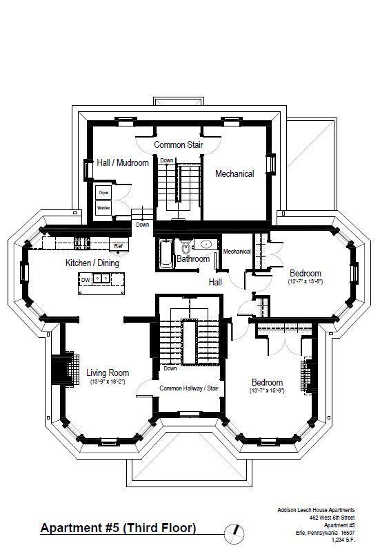 This absolutely stunning building has been renovated from top to bottom and inside and out but still preserving history! Units include: hardwood flooring throughout most rooms, ceramic tile bathrooms, granite cabinet tops, LED lighting, private parking and exterior video surveillance. The two bedroom, one bathroom unit is located on the third floor, perfect for the stunning views along West Sixth Street. Unit also includes full washer/dryer right inside of the unit. Storage unit located in basement of building. Tenant pays: gas, electric, cable, phone and internet. Rent includes: water, sewer, trash, common area landscaping and snow removal. Measurements and pictures are estimates: Living Room - 14 feet x 18 feet Bedroom 1 - 14 feet x 16 feet Bedroom 2 - 13 feet x 14 feet Kitchen Bathroom Mudroom Two parking spots. No pets allowed. Does not participate in Section 8. Erie School District