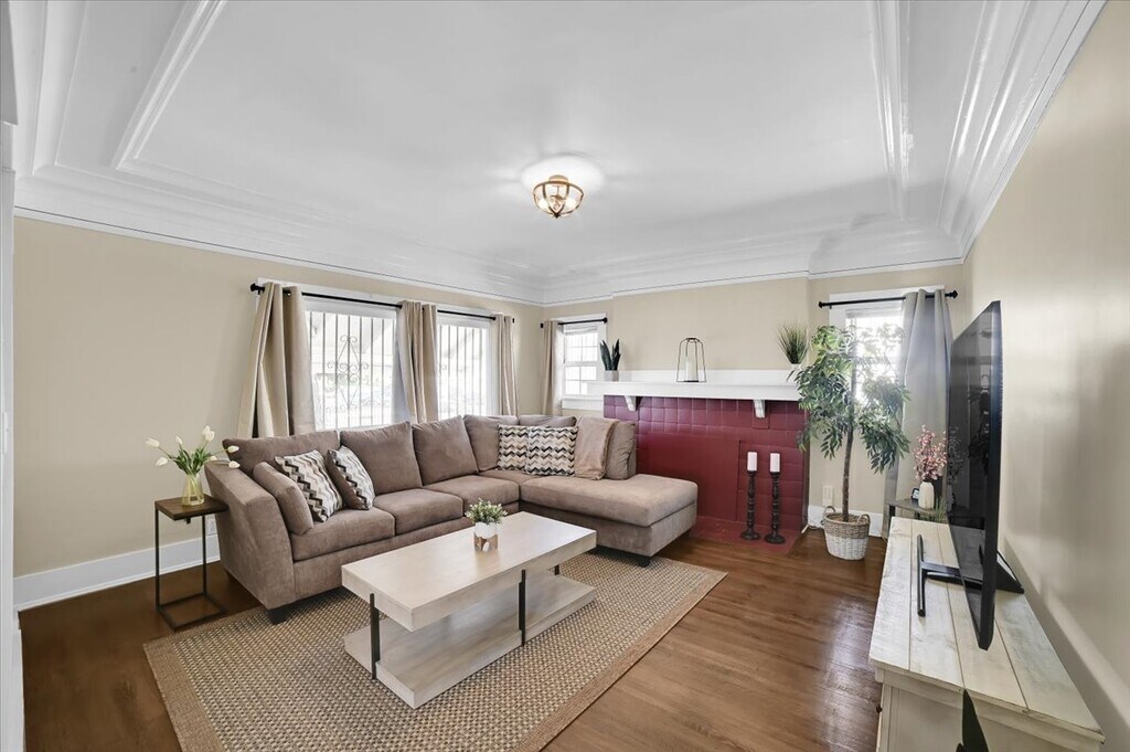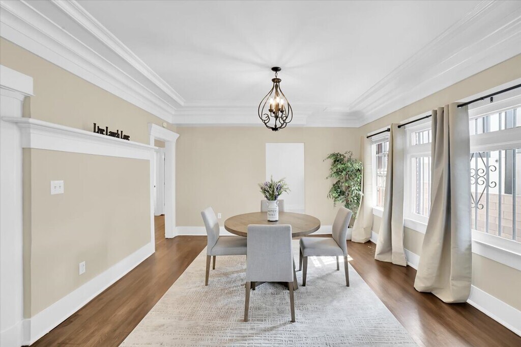 Beautiful remodeled 1912 Craftsman oozing with charm and character. Adorable front unit in duplex style residence with enchanting oversized front porch and gated grassy yard ideal for Al-Fresco dining or just relaxing with your favorite book or pad and your favorite beverage. Exquisite period detail finishes with impressive large crown moldings, baseboards, and window and doors with wood framing and casings. Fantastic spacious public rooms filled with an infusion of light and framed by beautiful hardwood floors. Remodeled bathroom with tiled shower and floors. Well appointed primary bedroom and a secondary bedroom/office. Flexible floor plan with stunning large living room and gorgeous sumptuous formal dining room. Updated large eat in kitchen with granite countertops and tiled floors. Includes interior stackable washer and dryer, stove and microwave, double pane windows and 1 car parking in back. 2 wall AC units included. Front porch views of front yard and greenbelt island and trees across the street. Excellent Mid-City central location near Pico and La Brea and close to 10 freeway, downtown Los Angeles, Wilshire-Fairfax area, shopping centers, schools, restaurants and public transportation. Welcome Home! 1, 1100 sf est. Owner will consider one dog under 25#s or a cat. Sergio Arnold, DRE #01249651, Coldwell Banker