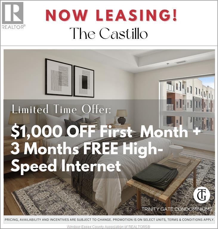 Welcome to Trinity Gate Condos,Award-winning development and proud winner of the 2024 WEHBA Award of Distinction.Phase3-Castillo now available leasing,with occupancy Mar 1,2026. Opportunity to be 1st tenant in brand-new,professionally managed smart building with luxury finishes throughout. 1068sqft. Morano I unit offers 2B and 2 Bath with custom-designed open-concept kitchen,dining,and living area. Vinyl plank flooring,porcelain tile,quartz countertops,upgraded Whirlpool appliances,9-ft ceilings,spacious PB W walk-in closet and ensuite. in-suite laundry/storage,private balcony with glass railing,10""wall pad with controls for HVAC,security cameras,and video feed to the lobby. Amenities: Sit-in lobby with free wifi,Gym,party room,outdoor pavilion,EV chargers,Handicapped and visitor parking,Keyless access system,and Neighborhood commercial s-pharmacy,express,café. Located near Nextstar,Amazon,Minth Group,Bus Stop,schools,parks,trails,shopping,restaurants,401 and airport. Rent is 2395+utilities,One outdoor parking and grounds maintenance included,no condo fees. Mandatory Bell Fibre high-speed internet (Smart One) $100/month (HST included,unlimited Wi-Fi). Min 1-yr lease.application,references,credit & employment check required. Lockers and bicycle racks (available for $50 per month). 80+ units available – pick your ideal home today. Promo-$1000 off + 3 Months Free Internet for 2b2b units March Move-ins Only. (id:52069) ID#: 2045093