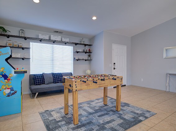 Fully Furnished 2,200 sq ft single story oasis with entertainers backyard. There are 7 beds + futon. There's a foosball table, 4 player The Simpsons arcade machine, 4 TV’s, PS4, Gas BBQ. This beautifully remodeled home on an oversized lot features newer kitchen with quartz countertops, new hardware, and soft-close cabinets. Carpeting in all bedrooms and Nest thermostats for the two AC units, and two ring cameras. Walking distance to shopping centers and restaurants.