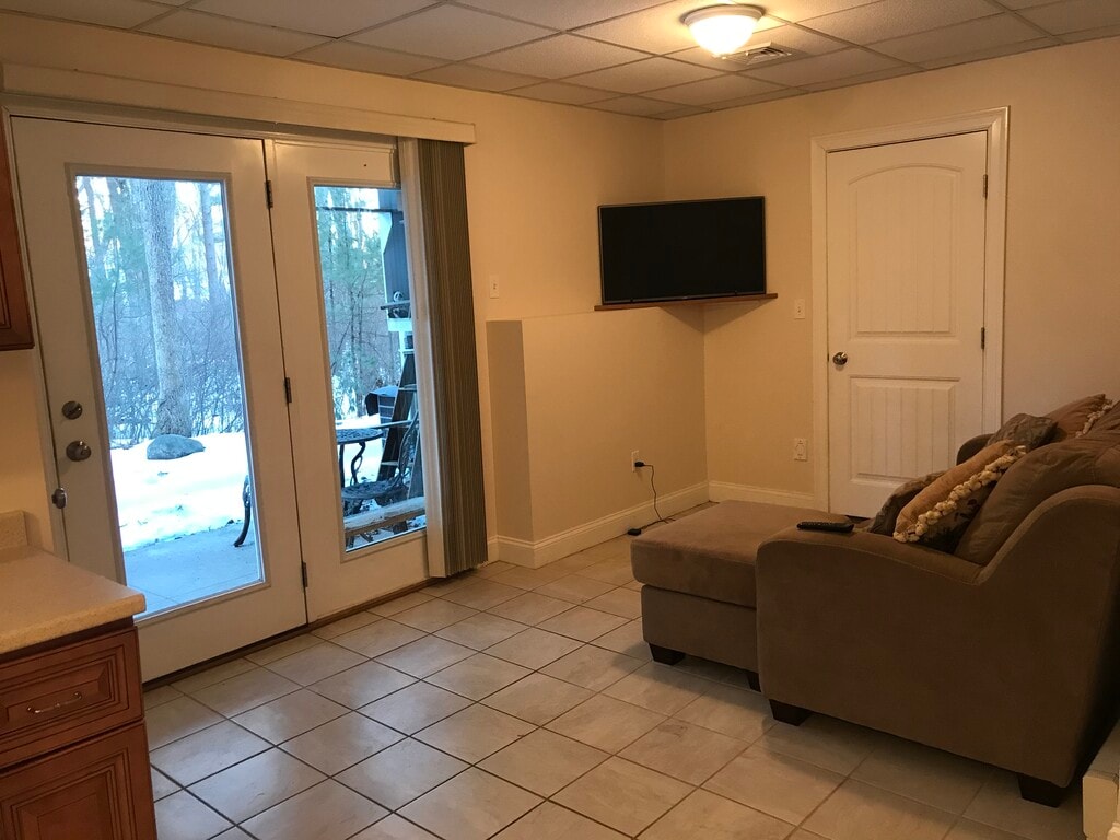 One bedroom apartment in existing home. Separate entrance with covered patio, one free parking space. Large kitchen with tile floors, bedroom with walk-in closet and stackable washer/dryer. Small living room with open floor plan to kitchen and dining area, and patio door with wooded view. Located on a quiet cul-de-sac and minutes from Burlington, Billerica, and Routes 93 and 128. First, last and security; good credit and references required. Rent does not include heat and electric. No pets, no smoking, quiet professional.
