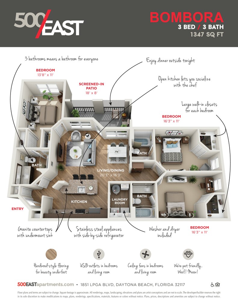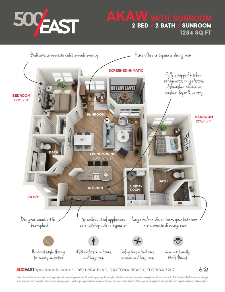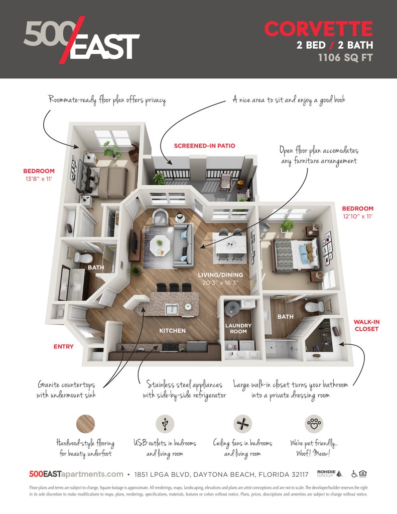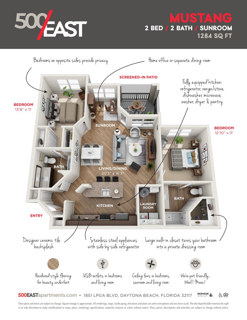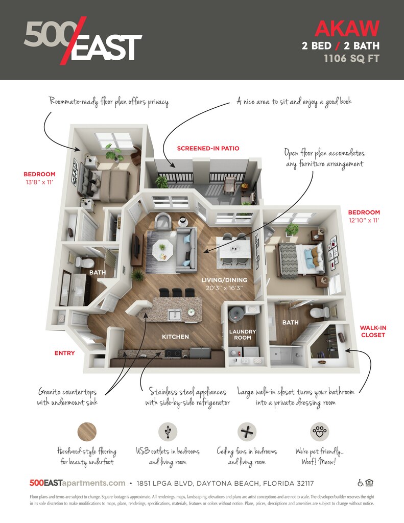 Live your best life at 500 East – we’ve redefined modern living with our brand new apartments, complete with innovative design and modern amenities in the heart of Daytona Beach, home to vibrant experiences and events. 500 East is the ultimate in luxury and pet-friendly Florida living, where every day is a vacation. Enjoy state-of-the-art amenities including a resort-style swimming pool, covered loggia with lounge and TVs, porch swings, outdoor kitchen and, a fire pit, fitness center, and so much more. Our apartments offer gourmet kitchens, stainless steel appliances, ceiling fans, sunrooms, screen in lanais, upscale finishes, and walk-in closets to ensure that you’ll love calling 500 East home! With a prime location just off of I-95, conveniently located near Daytona Beach International Airport, Daytona International Speedway, and LPGA International Golf Course, and just minutes to the World’s Most Famous Beach, you’ll always be near opportunities, adventures, and entertainment!