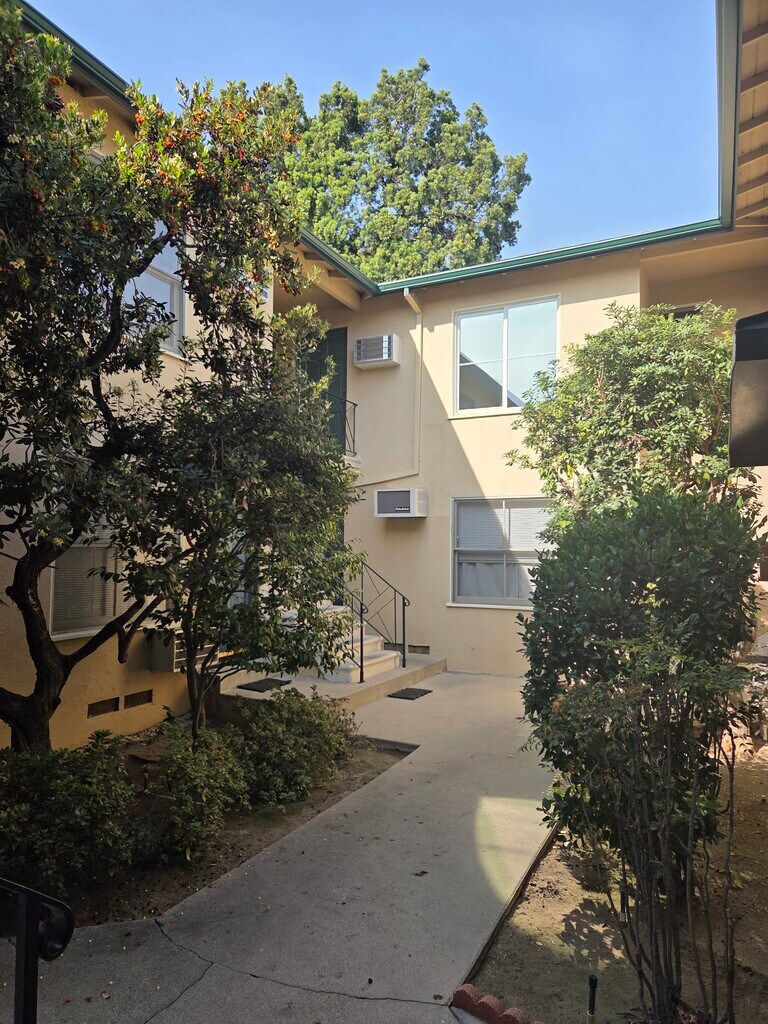 Well maintained and managed apartment building located in Valley Village, adjacent to Studio City and Sherman Oaks. Hot and Cold water included, in addition to one free, onsite, carport parking spot. Would accept one indoor cat. Upstairs one-bedroom/bath, plus den. Large kitchen with gas range, dishwasher and abundant counter/cabinet space. New carpet/pad throughout with tiled floors in kitchen and bathroom. AC in living room and bedroom with ceiling fans and handsome wood blinds throughout.