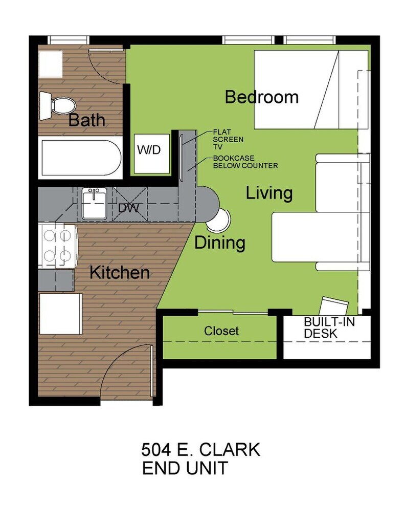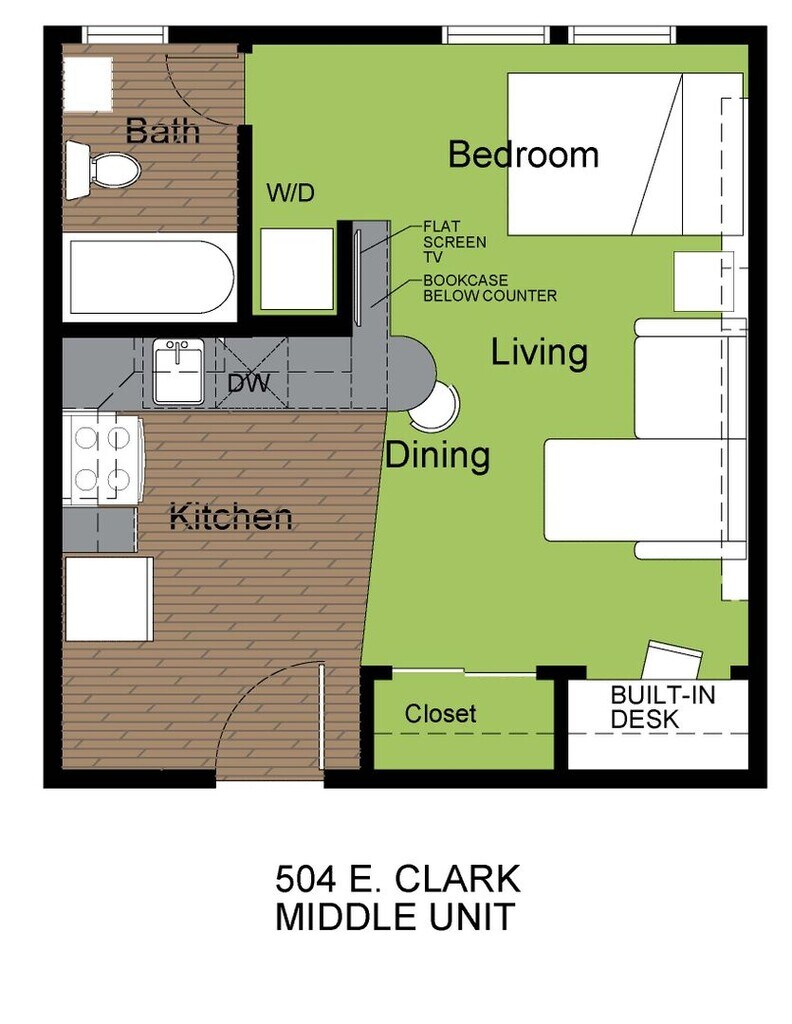 These completely upgraded studio apartments feature granite countertops, a dishwasher, plank flooring, and an in-unit washer/dryer. They are located just blocks from County Market and near the University of Illinois Engineering Quad. They also include a Smart TV and ample built-in shelving for storage. Utility fees will range based on unit size, but the utilities included are water, internet, sewer, trash, and recycling! Pets welcome! See our Leasing FAQ! Leased parking available! Income Requirement Waived for UIUC Students! Co-Signer Not Required for Qualified Applicants! Low admin fee or security deposit equal to 1-month rent installment – you choose!