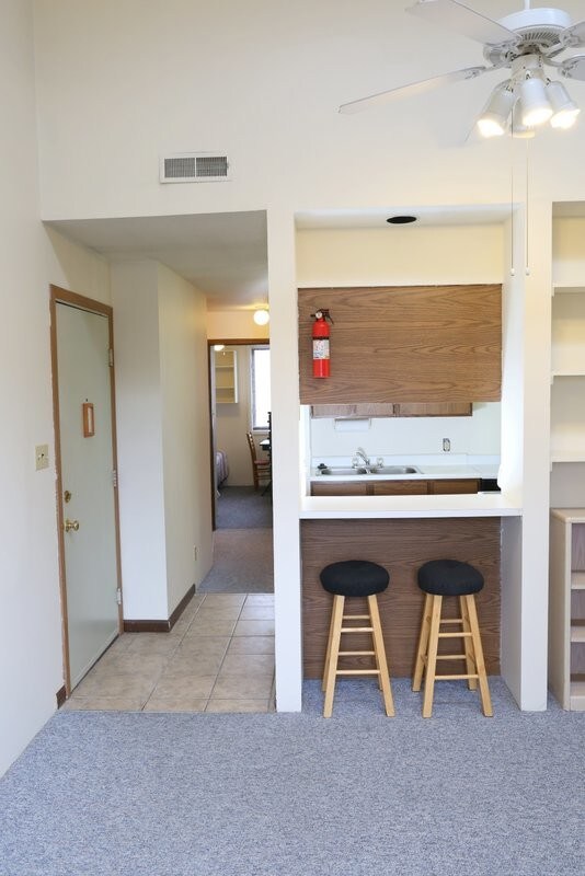 Large furnished 2 bedroom apartments (900-1,050 sq. ft.) include: kitchen, dining room, spacious living room with a ‘pass though’ bar to the kitchen, bedrooms, and a screened-in balcony. The bathroom has a full-size tub/shower and a separate area with two sinks, so a person does not tie up the entire bathroom. Units on the top floor have cathedral ceilings. Included in all units: free super-fast fiber optics Internet, refrigerator, stove, microwave, garbage disposal and dishwasher. The building has a bicycle rack and key-access to a large on-site laundry facility. Assigned off-street sheltered parking is also available. These apartments are located: 1 block west of the engineering quad; 2 blocks from County Market grocery store; and across the street from Far East grocery store. A one-minute walk gets you to the bus stop with four frequent bus lines (every 10 minutes for Yellow and Teal) to zoom you to anywhere on or off campus.