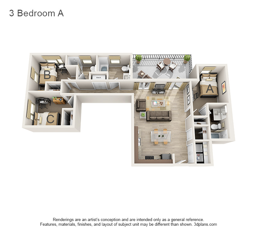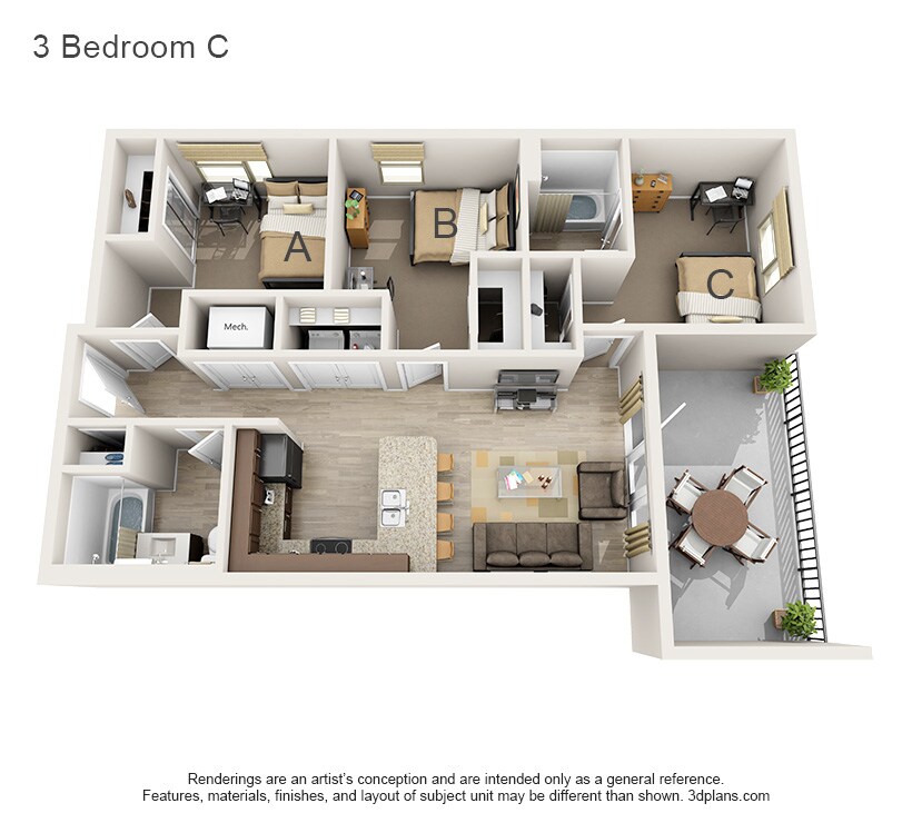 3BR/2BA - C - Floorplan 1 3BR/3BA - A