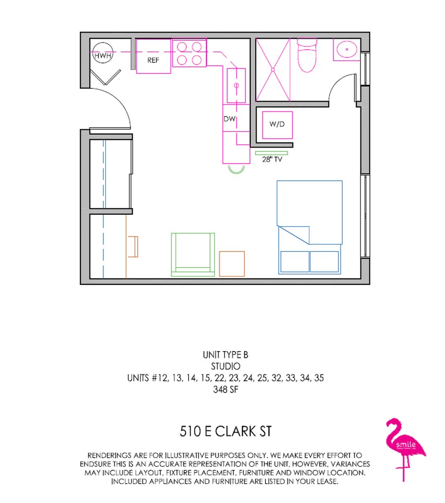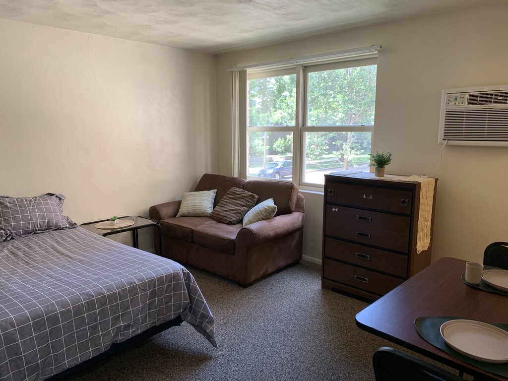 These cute, fully furnished studio apartments feature a large living/bedroom area, full bath, ample closet space, and a complete kitchen. They also have a spacious and convenient built-in study area with a wired ethernet connection! They are located near the University of Illinois Engineering Quad and County Market. It is a comfortable and convenient place to live and study! Utility fees will range based on unit size, but the utilities included are water, internet, sewer, trash, and recycling! Pets welcome! See our Leasing FAQ! Leased parking available! Income Requirement Waived for UIUC Students! Co-Signer Not Required for Qualified Applicants! Low admin fee or security deposit equal to 1 month rent installment – you choose!