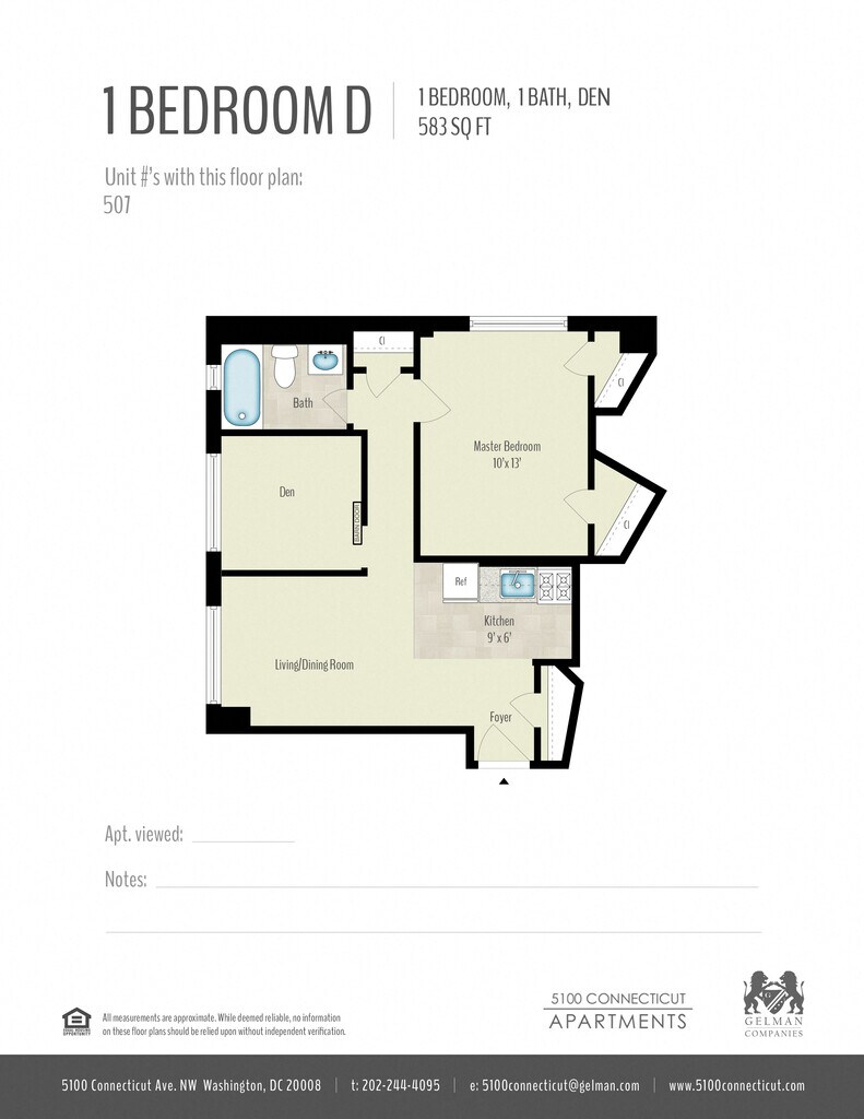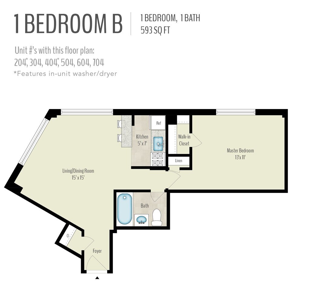 1 Bedroom + Den - Floorplan 2 Apartment Unit: 0507Apartment Model: 1 Bedroom + Den$2,1501 Bedroom, 1 Bath, 583 sq ftAvailable Now![]()