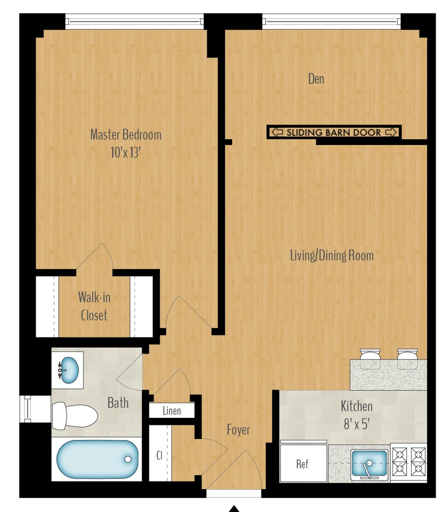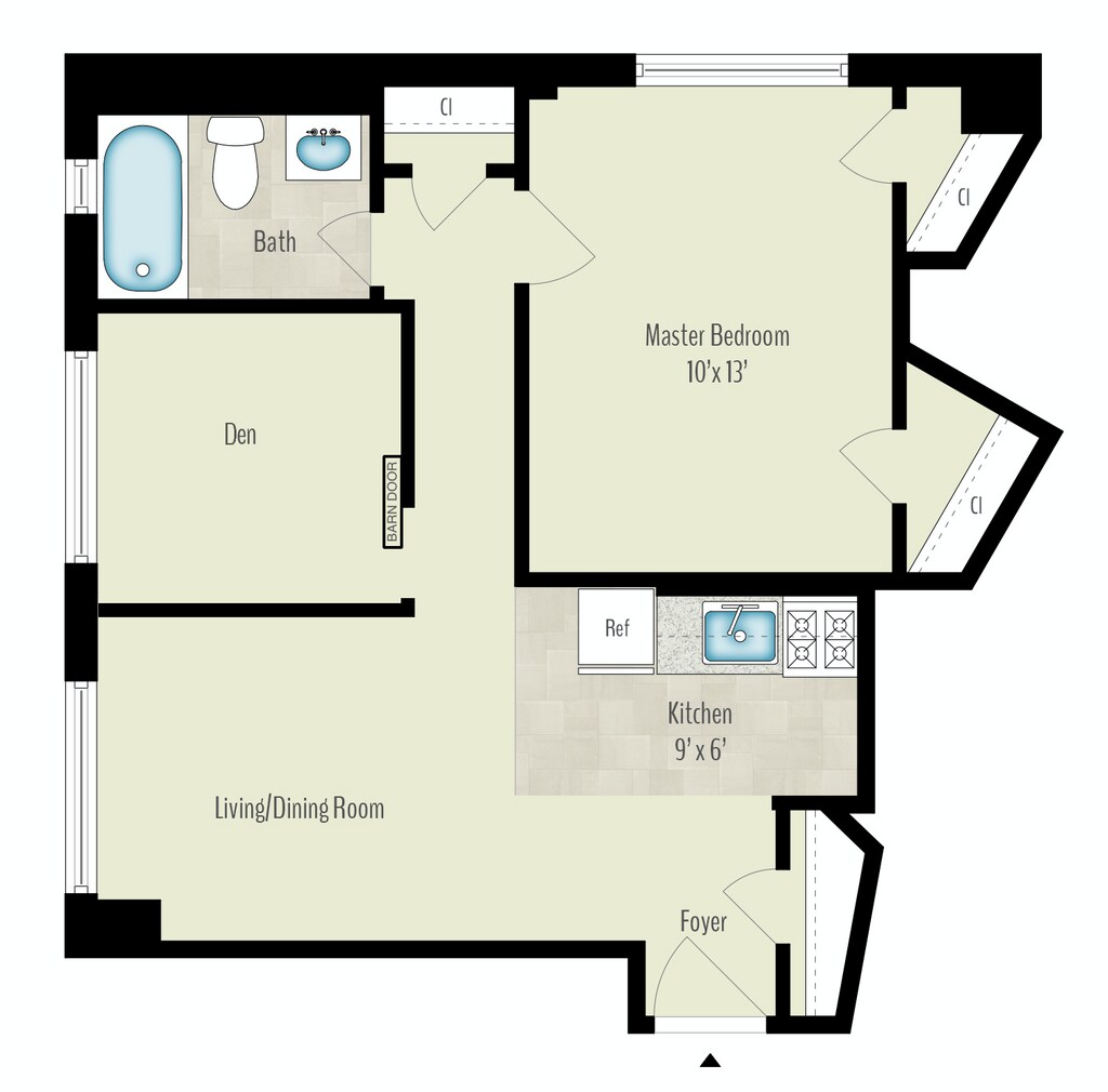 Apartment Model: 1 Bedroom + Den$2,1501 Bedroom, 1 Bath, 583 sq ftAvailable Now![]()