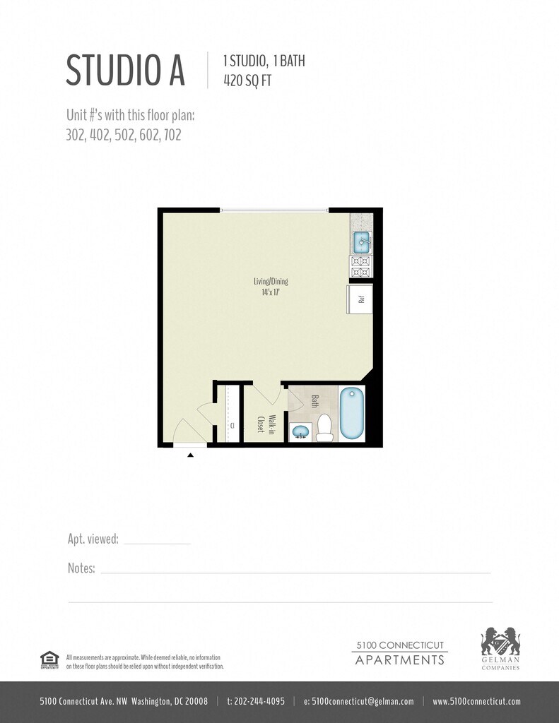 October 5, 2020I lived in a studio for 2 years while attending school. The studio was decent - small when compared to other studios in a similar price range. However, the building is fairly small which in turn means there is very little noise. Management was typically responsive to maintenance requests, and upper management was very helpful when there were any issues with the building and/or the onsite manager. My honest recommendation is if you are a student who is looking to live alone in a studio for a one ...year lease - this is a pretty decent deal. However, your rent will increase after the first 12-months based on the D.C. rent control rates. The neighborhood is pretty safe, and the neighborhoods offer great places to walk/run. Buses make getting to Tenleytown/Van Ness very easy. It is also a nice 20ish minute walk to get to either Tenleytown/Van Ness. Daily maintenance keeps the common areas clean, and most mornings you will see the nice individuals who are responsible for emptying floor garbage rooms/cleaning the lobby. The laundry room is communal and typically clean. While all unit utilities (including AC) are included, there are really no additional amenities. If your budget allows, there may be nearby studios for a bit more that also include onsite gyms, roof tops, etc. But if your budget is your bottom line, 5100 is a decent place to start, especially if you are new to D.C.Read MoreReview from Apartments.com