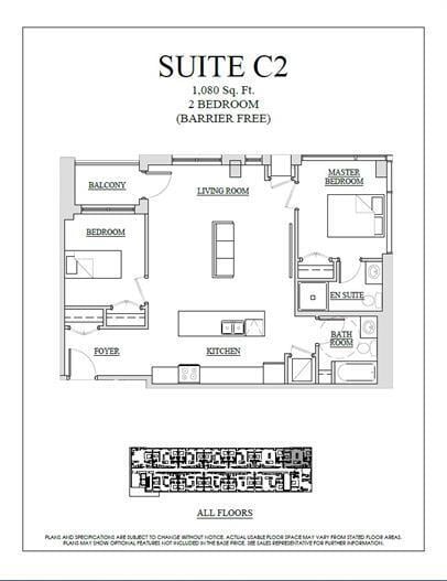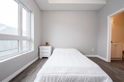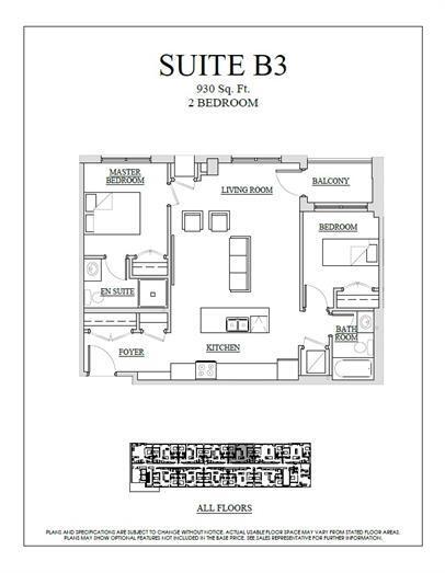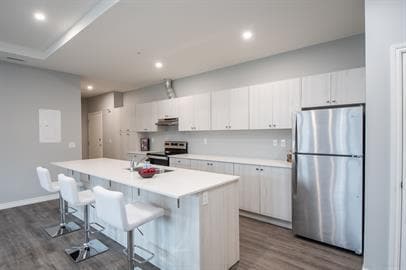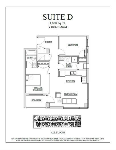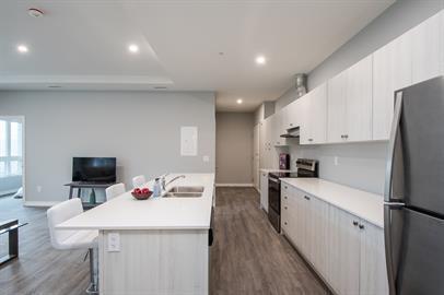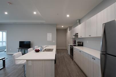 Model Suite D (1,000 sq ft) 2 Bedroom / 2 Bath Suites: #513 $2,695.00 per month plus parking Utilities: Plus Hydro, Heat & Water (separately metered) Apartment Features: Modern open-concept suite layouts High ceilings Wide plank luxury vinyl flooring Stacked front-load washer and dryer Private balcony Window coverings Energy efficient stainless steel kitchen appliances Kitchen appliances include refrigerator, stove/oven and dishwasher in each suite. Contemporary flat panel kitchen cabinetry Quartz counter-tops Stainless steel double kitchen sink Chrome finish faucet and shower heads Porcelain wall tiles in shower. Framed clear glass shower door and moisture resistant shower light. Individually controlled central air conditioning and heating.