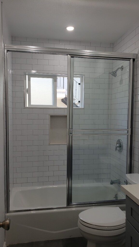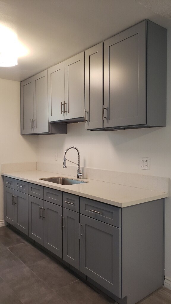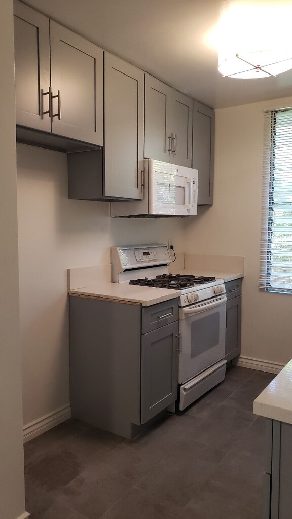 [4:26 PM] Matthew Funston Beautifully remodeled unit including all new kitchen and bathroom. Located on ground floor with large patio. New kitchen cabinets, white quartz stone countertops, new microwave, designer faucet and large tile flooring. White subway tile shower with custom clear glass shower door. Beautiful large tile flooring. New vanity with white quartz stone countertop. Recessed lighting. New plumbing fixtures, including Kohler elongated toilet. Custom mirror over vanity. Gray laminate flooring throughout living area, hallway and bedroom. Looks like hardwood, but more durable. No carpet. Designer lighting fixtures in kitchen, dining area and bedroom. Lots of closet space. One covered parking spot. Laundry on premises.