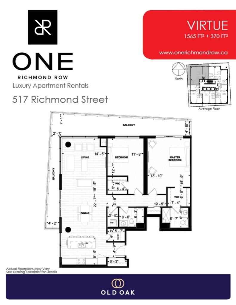 517 One Richmond Row offers 1 to 2 Bedroom apartments starting from $2,330 and having 925–1,565 sq ft. Here is the current pricing and availability: