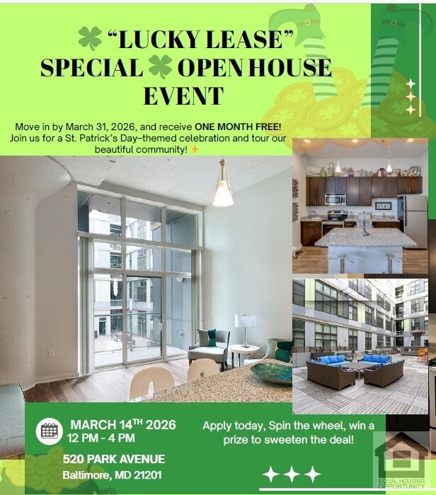 ?? “Lucky Lease” Special ?? Open House Event Saturday, March 14th ; Move in by March 31, 2026, and receive ONE MONTH FREE! - Open House Event Saturday, March 14th 12:00 PM – 4:00 PM Join us for a St. Patrick’s Day–themed celebration and tour our beautiful community! ? Apply onsite and spin our Prize Wheel for a chance to win exciting giveaways!