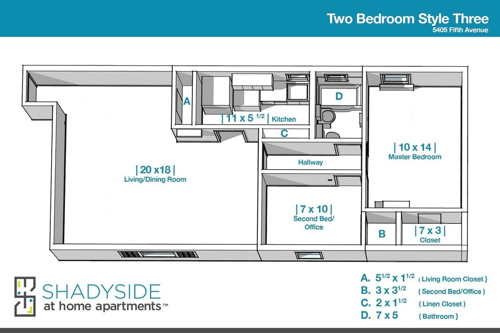 Two Bedroom Apartment At 5405 Fifth Avenue Style Five - Prime location! Located at the corner of S. Aiken Avenue and Fifth Avenue this is considered the "Entry To Shadyside" as you turn down towards Shadyside’s 120 plus shops and restaurants. This building features all remodeled two bedroom apartments with central air, key card security access, on-site laundry facilities, on-site resident manager, and 24 hour security cameras. Perfect for roommates or someone who wants to turn the second bedroom into a home office. Tenant fitness center across the street. Bike garage, picnic area and closed in dog park on side of the building! Please note that this is a Style Five apartment. We have multiple identical versions of this apartment available. Please inquire about additional Style Five's that may be available. Walking distance to University of Pittsburgh, Carnegie Mellon University, Chatham University UPMC Shadyside and Hillman, and Bakery Square. Click below for an immersive look inside the apartment with a 360 VR Tour. https://kuula.co/share/collection/7lCmX?fs=1&vr=1&sd=1&initload=0&thumbs=1&chromeless=1&logo=0 For more information, click on the link below to visit our website: https://shadysideathome.com/ Dimensions: Living Room: 20 ½ x 18 Living Room Closet: 5 x 2 Master Bedroom: 12 x 14 ½ Master Bedroom Closet: 4 x 2 Bathroom: 7 x 5 Linen Closet: 3 x 2 Second Bedroom/Office: 8 x 10 SB/Office Closet: 4 ½ x 2 Kitchen: 11 x 5 ½ (RLNE5857799)