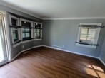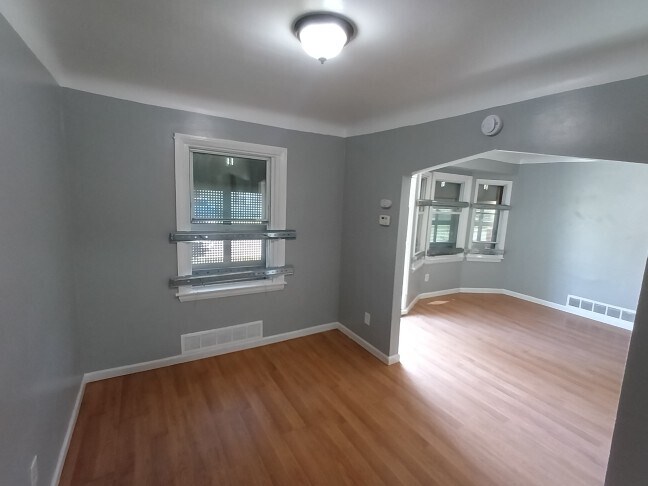 This is a 3-bedroom, 1-bath ranch-style home for rent on Detroit's Eastside in the Jefferson Chalmers neighborhood. The recently updated interior features modern gray paint and light floors, a living room with a breakfast nook, and large windows for natural light. This property is perfect for individuals or small families. Conveniently located near parks, the Detroit River, and local dining.