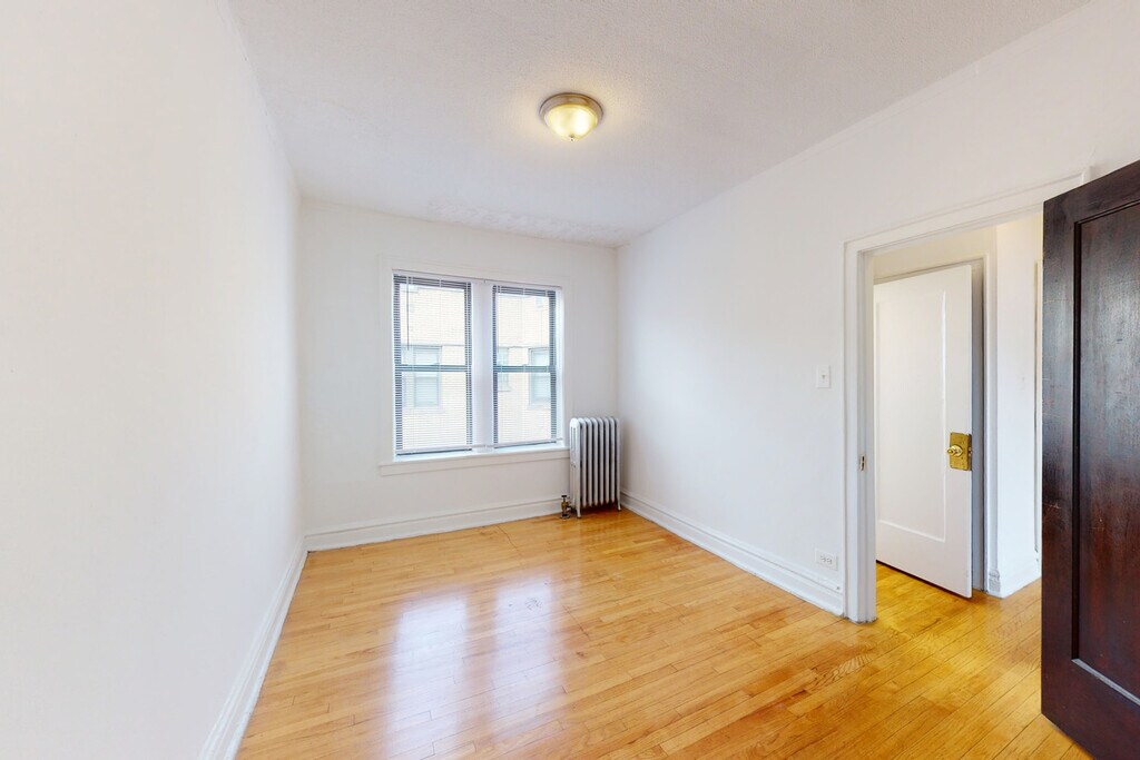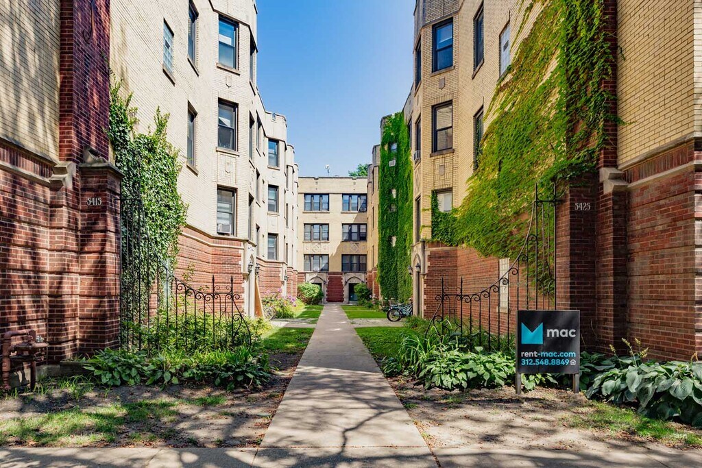 A solid red brick base grounds this long, narrow courtyard property, while the yellow brick facade marked by projecting waves of bay windows, extends upward toward the Mission roof-line. Wrought-iron gates welcome residents into the cozy manicured grounds, located a short distance from Washington Park and the University of Chicago, with Hyde Parks Restaurant Row just a few minutes away.