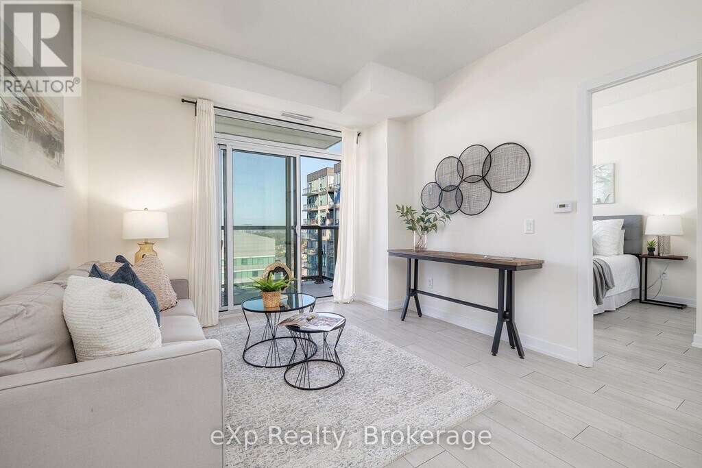 Welcome to this stylish 2-bedroom,2-bathroom condo in the heart of downtown Kitchener,complete with a parking space! Perfectly situated just steps from City Hall,Victoria Park,the tech hub,restaurants,shops,and transit,this location offers unmatched convenience and vibrant urban living. Inside,the open-concept layout is filled with natural light,featuring a modern kitchen with sleek appliances and a bright living room with walkout to a private balcony with 14th floor views. The primary bedroom includes a 3-piece ensuite,while a second bedroom and full bathroom provide comfort and flexibility for guests,a home office,or family living. Additional highlights include in-suite laundry,bicycle storage,and access to a beautifully landscaped ground-level courtyard with bike racks. A rare find that combines contemporary living,thoughtful amenities,and the ultimate downtown lifestyle. (id:52069) ID#: 2048148