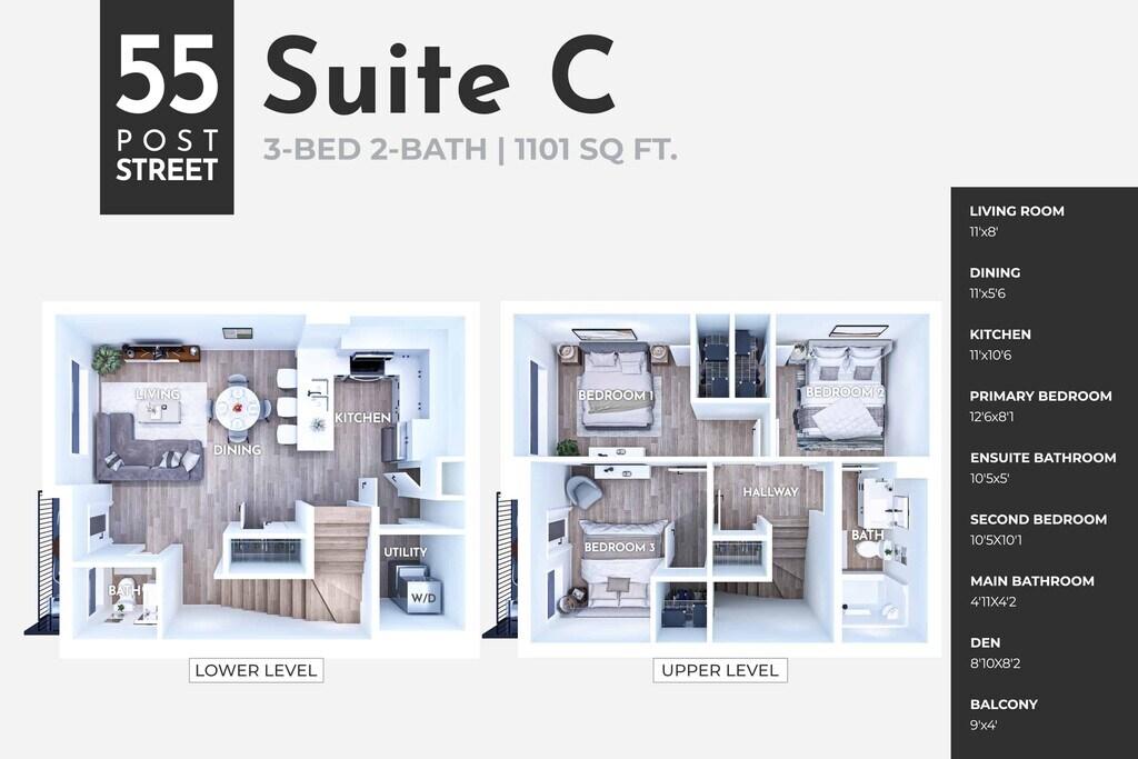 Suite C - Floorplan 8 Apartment Unit: 102Apartment Model: Suite C3 Bedroom, 2 Bath, 1101 sq ftAvailable NowApartment Unit: 106Apartment Model: Suite C3 Bedroom, 2 Bath, 1101 sq ftAvailable NowApartment Unit: 109Apartment Model: Suite C3 Bedroom, 2 Bath, 1101 sq ftAvailable NowSuite D