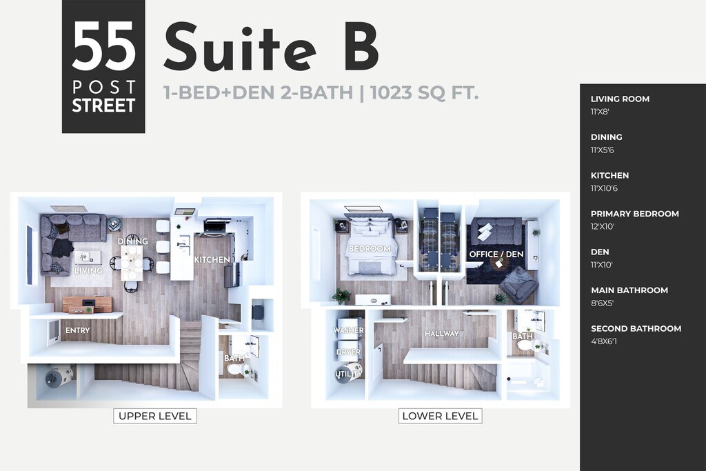 Suite B - Floorplan Apartment Unit: 104Apartment Model: Suite B2 Bedroom, 2 Bath, 1023 sq ftAvailable NowApartment Unit: 105Apartment Model: Suite B2 Bedroom, 2 Bath, 1023 sq ftAvailable NowApartment Unit: 107Apartment Model: Suite B2 Bedroom, 2 Bath, 1023 sq ftAvailable NowSuite A