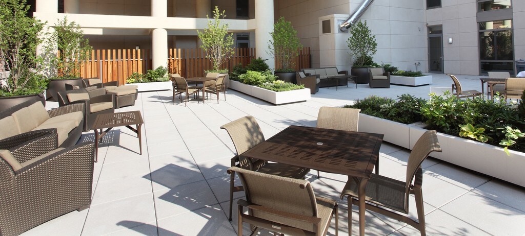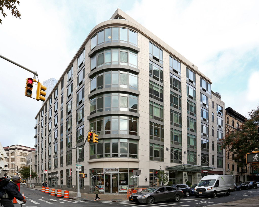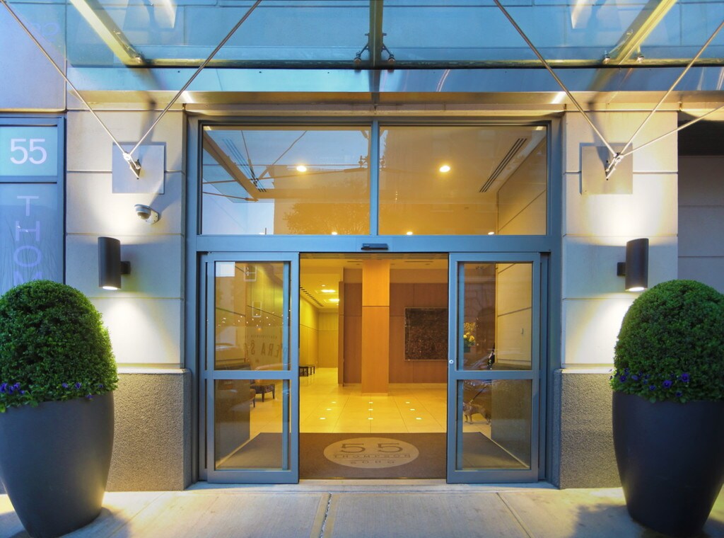 Just like Soho, 55 Thompson® is a one-of-a kind, intimate, boutique rental building with only 38 residences, offering a level of service, amenities, room sizes and finishes that surpass any rental building in SoHo and indeed in all Downtown New York. The apartments feature all of the best features of Soho loft design and lifestyle – flowing expanses of open plan space, 10 foot ceiling heights, walls of windows and limed 4 inch solid white oak floors. Many feature glowing gas fireplaces and private balconies or grand walk-out terraces. Top floor penthouses have skylights. The great rooms offer a surplus of space to relax and entertain in style. The open kitchens featuring rift cut limed white oak cabinetry with insert doors thick slabs of rainforest polished stone countertops, wheat colored Viscaya polished glass tile backsplash, Kindred 30 inch stainless steel under mount sink with stainless steel, Whitehaus pullout spray/steam faucets, pull out cabinets with double trash bin for recycling, wood paneled built in 30 inch Subzero refrigerator/freezer, 30 inch stainless steel Bertazzoni gas range, Bosch stainless steel dishwasher, LG built in stainless steel microwave oven, oversized limed white oak vanities with polished Silver, Travertine slab countertops and double undermount sinks. The luxurious baths feature triple-view mirrored medicine cabinets with integrated lighting, Iridian Metalwood porcelain wall tiles, Steelworks Bronzo porcelain floor tiles, Kohler Maestro 5’-6” under mount soaking tub with polished Silvern Travertine slab tub decks, separate stall showers with frameless glass shower doors, Toto Aqua dual flush elongated toilets with soft close seats, polished chrome Kohler stillness faucets, shower and tub, spouts and hand showers. The building also features a fitness center and a fully landscaped terrace on the 2nd floor for residents.