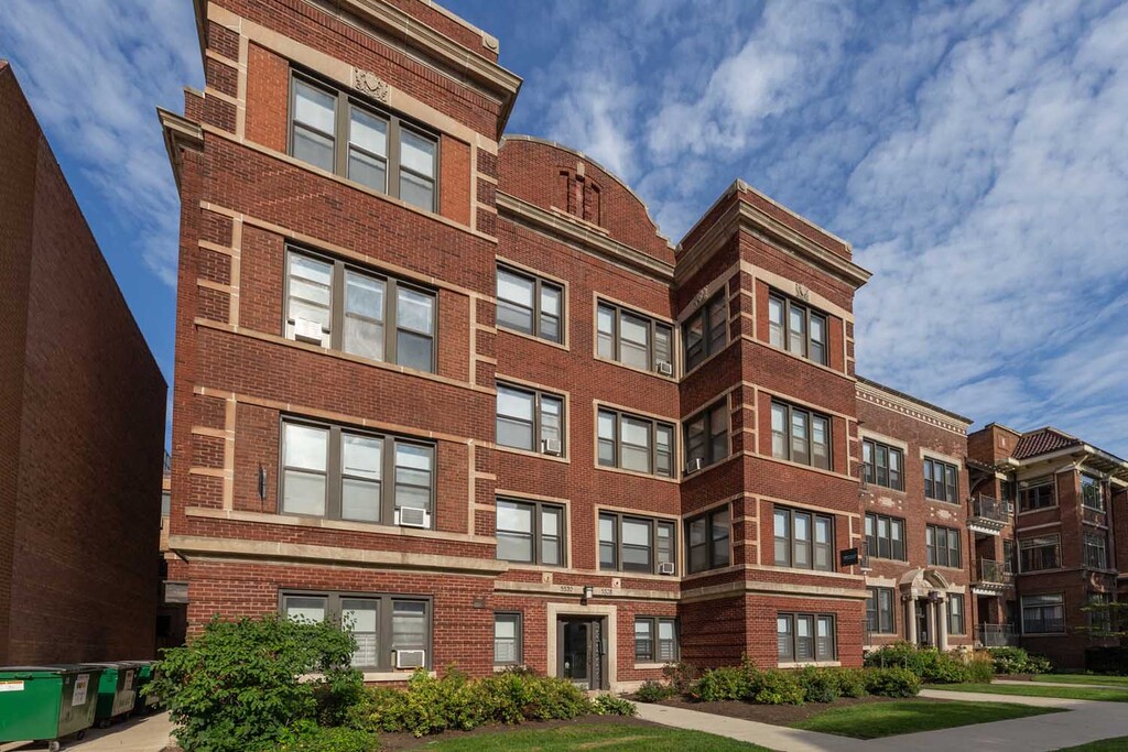 The building was gut rehabbed in 2016 and everything inside is new. True to the mix of styles found throughout Hyde Park, 5524 blends the rustic beauty of brick and stone, featuring geometric keystones, expansive articulated window openings, and geometric terra cotta ornamentation highlighting the roofline. In contrast, the commanding entry, flanked by Ionic pilasters and topped with an ornate pediment, reflects a Grecian influence. A landscaped lawn surrounds the front of the building, located a short distance from Lake Michigan and public transportation.