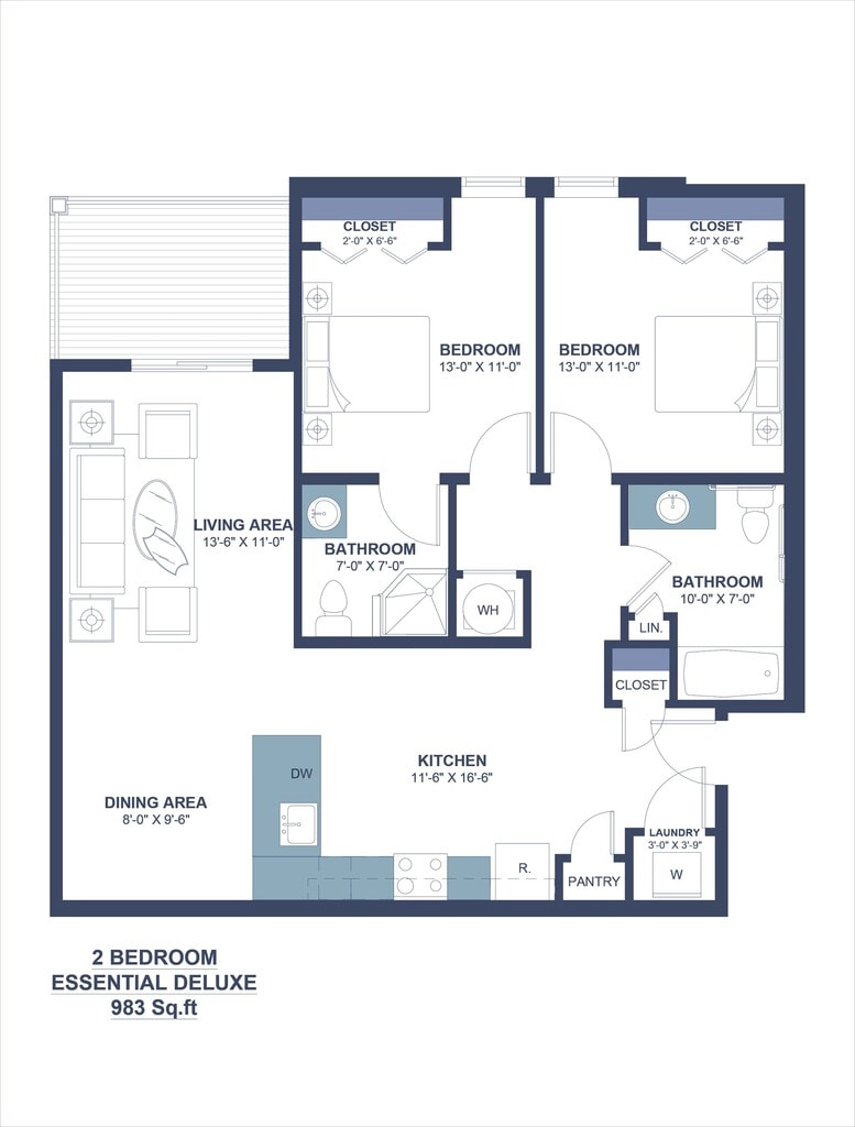 Two Bedroom, Two Bathroom - Floorplan 2 Apartment Unit: 102Apartment Model: Two Bedroom, Two Bathroom2 Bedroom, 2 Bath, 983 sq ftAvailable June 1, 2026Two Bedroom, Two Bathroom II