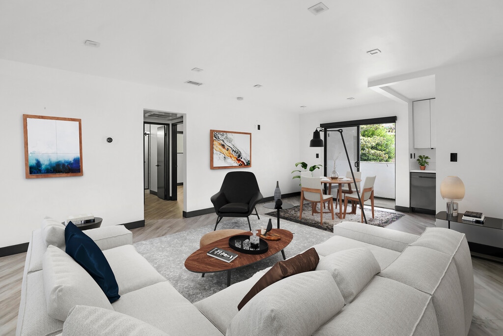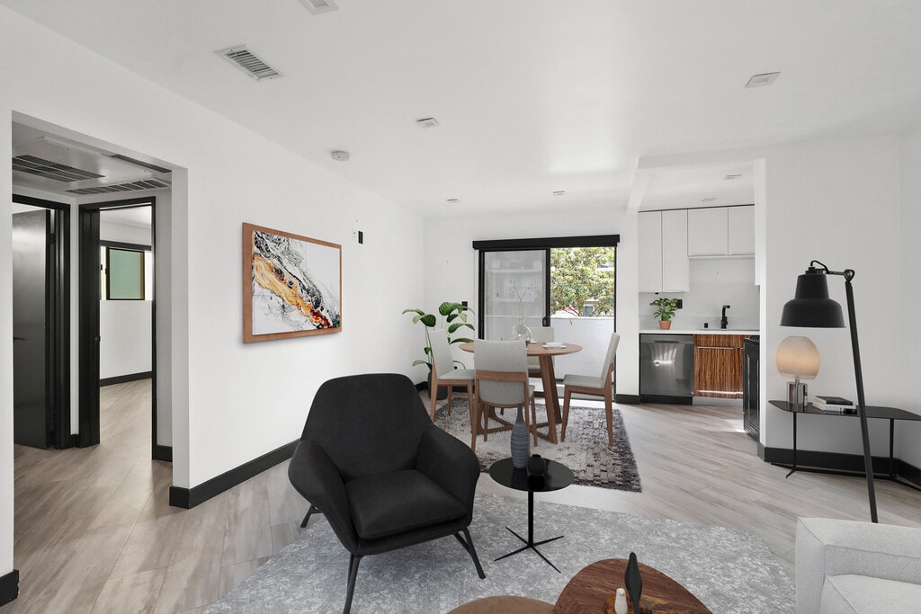 Inspired by midcentury Modernism architecture, these newly renovated rental homes in Hollywood are just minutes to the new Netflix corporate headquarters, the Sunset Bower studios, and the Sunset Gower studios. The thriving Downtown Los Angeles is just minutes away on the nearby 101 Freeway. 5667 La Mirada Avenue, located in the heart of central Los Angeles in the Hollywood Studio District neighborhood, features a nine-unit, two-story low-rise building with enhanced modern architecture and a gray cement shade base and accents of earth tone colors. Carefully restored and designed by a renowned LA designer, these 1960s modern luxury rental homes feature keyless entry door locks to spacious one and two-bedroom floor plans with newly renovated kitchen and bathrooms. The kitchen boasts sparkling white stone quartz countertops with brand new self-closing cabinetry and high-end stainless-steel refrigerators with matching gas cooktop with oven and microwave. iRing doorbells with a smart home video security camera are also included as well as a stackable washer and dryer. Bathrooms feature porcelain tiled bath tubs and glass shower doors. Each rental home also includes central A/C cooling and heating with recessed lights with luxury style cellular shade window blinds and distressed wood plank floors. With a surge of gentrification, this area’s popularity has grown significantly over the recent years by catering to families, young professionals, and hipsters alike, as an overflow effect and a more affordable option to Silver Lake, with its skyrocketing real estate values. The immediate area boasts new ground-up construction and small-lot development projects in recent years. The location of the community is also considered “Very Walkable”, with an 86 Walk Score and situated a short distance from many desirable dining options and the Metro Red Line. Drake Real Estate Group | Welcome home | Schedule your private viewing | | EXTERIOR | - Newly Modernized Façade - City Approved & Completed Earthquake Seismic Retrofit - Keyless Electronic Entry | INTERIOR | - Cellular Shade Window Blinds - Spacious Designer Floor Plan - Vinyl Plank Flooring | KITCHEN | - Modern Designer Cabinetry - Quartz Countertops - Stainless-Steel Appliances - Refrigerator - Range w/ Oven - Microwave - Open Kitchen Space Layout | BATH | - Tiled Shower and Bath - Glass Shower Doors - Oversized Vanity Mirror | AMENITIES | Washer & Dryer (in unit) - Assigned Parking - A/C Units