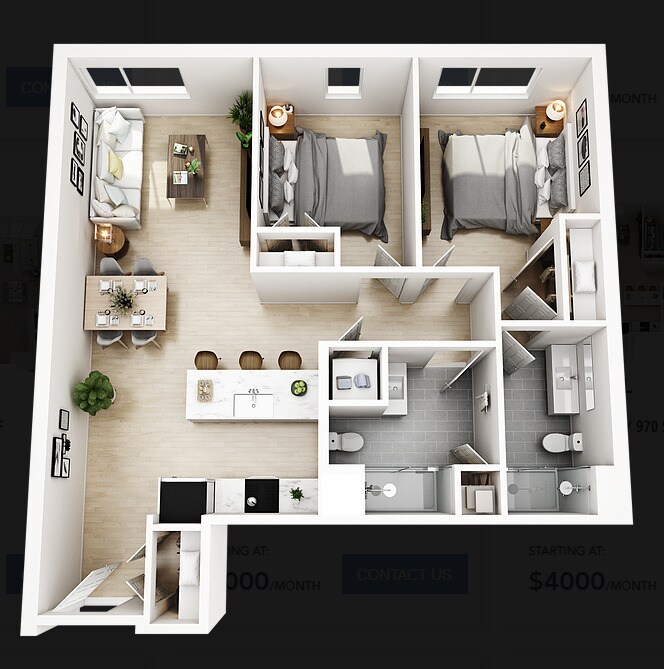 Apartment Model: 2 Bed 2 Bath Style Q$4,5002 Bedroom, 2 Bath, 1110 sq ftAvailable Now![]()