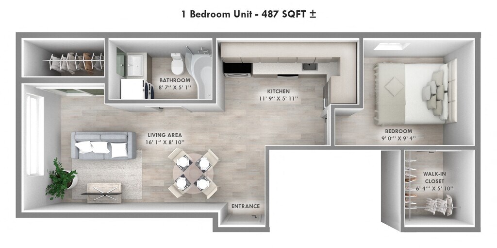 Apartment Model: 585 Corydon - 1 Bedroom, 1 Bath - Layout B1 Bedroom, 1 Bath, 472 sq ftAvailable January 1, 2026![]()