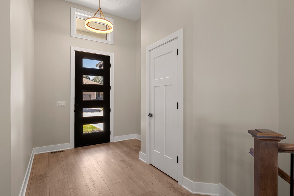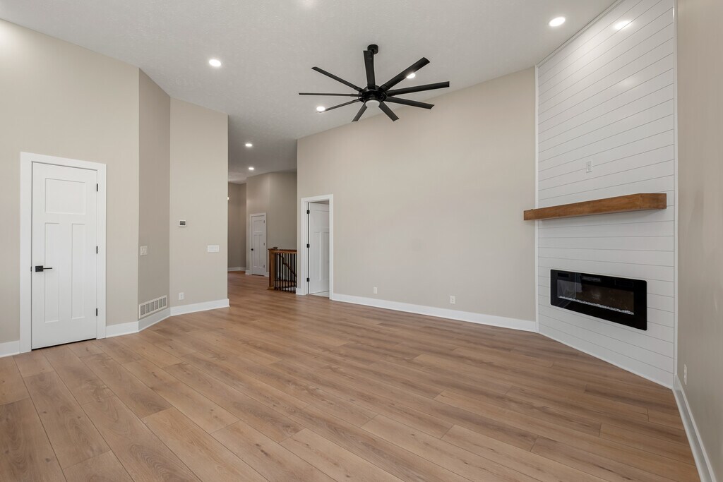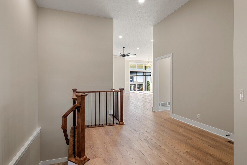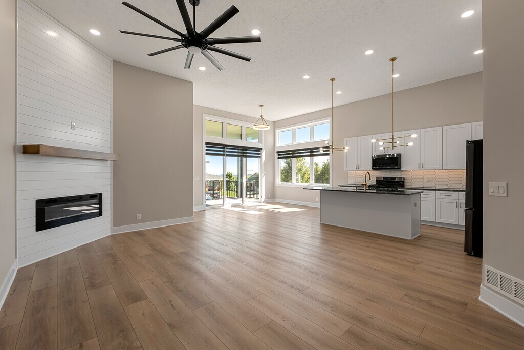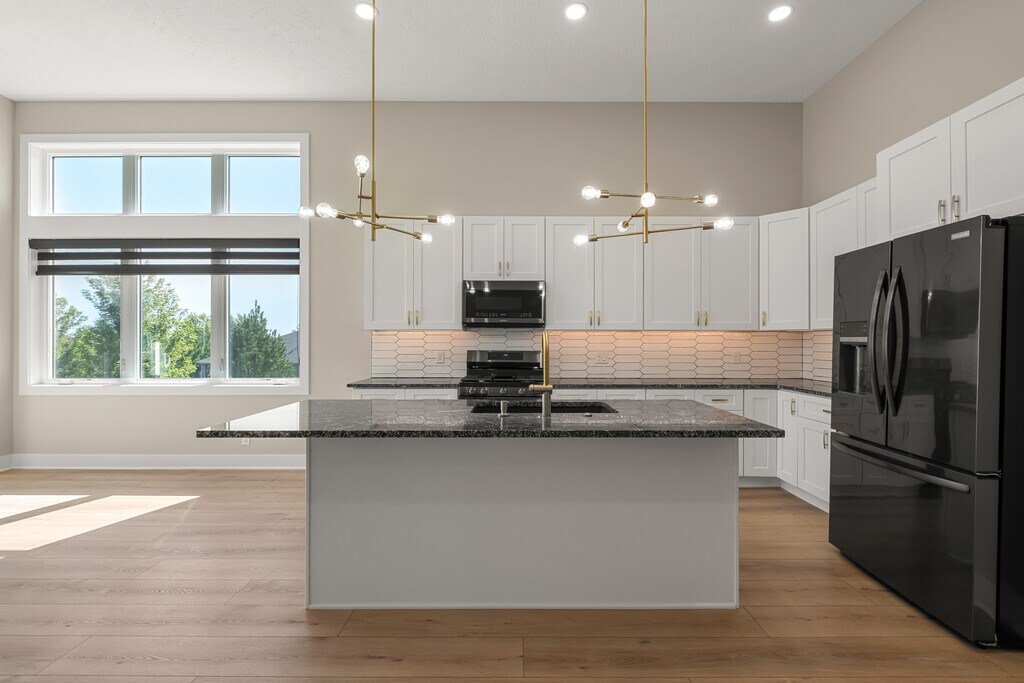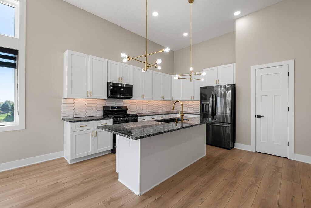 Brand new Copper Ridge townhome in a serene location pairs luxury finishes with low maintenance living. The main level features an airy open plan under 12' ceilings, anchored by a floor to ceiling shiplap fireplace, with LVP flooring, custom windows, and a gourmet kitchen. The primary suite includes a spa like bath with dual sink vanity, tiled walk in shower, jetted tub, and private access to the covered composite deck. Main floor laundry adds everyday convenience. Never occupied and move in ready, the home offers modern appliances, LED lighting, and a stylish backsplash. The finished daylight lower level extends the space with a large great room and wet bar, two bedrooms, a bath, and generous storage. Premium finishes throughout balance elegance and function. HOA covers lawn care, snow removal, trash service and maintenance for easy living.