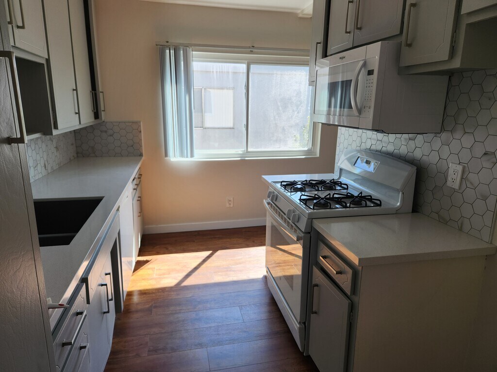 This is a spacious, second floor unit in a small, owner occupied building. Walk-In closet in primary bedroom with wall to wall mirrored closet in secondary bedroom. Bathrooms are fully renovated with beautiful tile. The rest of the unit has brand new flooring throughout. A private balcony is included with direct access off of the living room thru a large sliding door. Off the balcony is a beautiful four season tree, which allows beautiful views and lots of light into the apartment! All windows and plumbing, as well as HVAC and roof are new within 10 years. We are small pet friendly, although NO parrots please. Lots of light and friendly neighbors. We are right next to the Metro G line, just blocks from LAVC, and close to all three freeways. This is a non-smoking property.