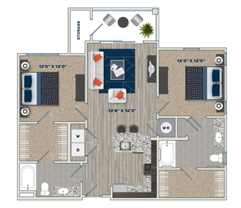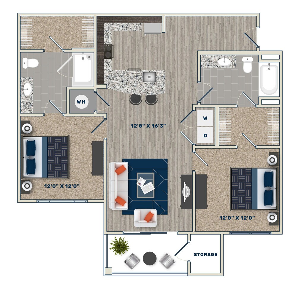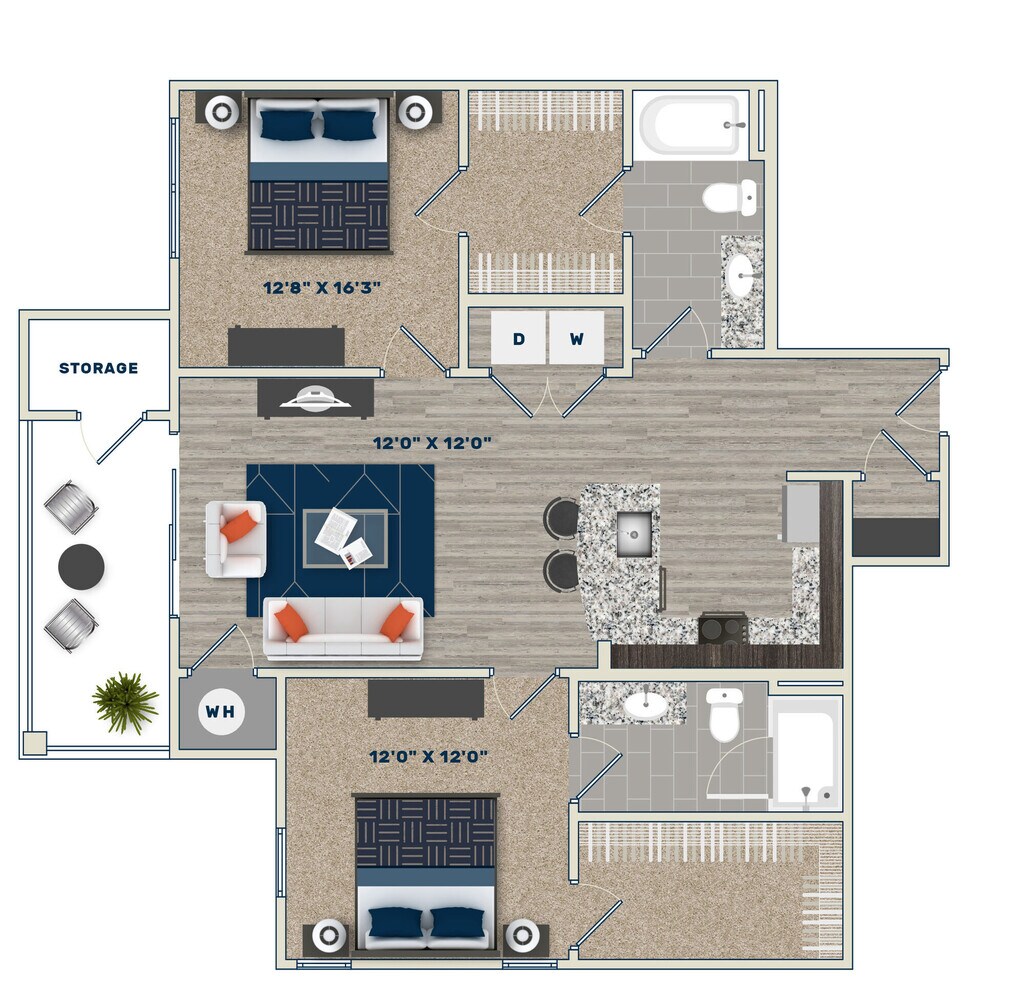 Apartment Model: B2D$2,1672 Bedroom, 2 Bath, 1210 sq ftUnavailable- Floor plans are artist's rendering. All dimensions are approximate. Actual product and specifications may vary in dimension or detail. Not all features are available in every rental home. Prices and availability are subject to change. Base rent is based on monthly frequency. Additional fees may apply, such as but not limited to package delivery, trash, water, amenities, etc. Deposits vary. Please see a representative for details. ![]() - B2D - Floorplan 1