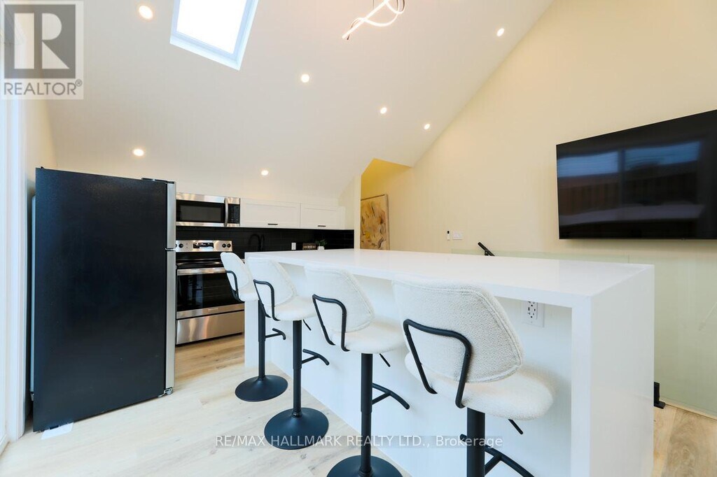 Introducing an exceptional standard of luxury living. Presenting a unique one-bedroom suite that seamlessly integrates modern elegance with practicality. Upon entry,one is welcomed by exquisite vinyl flooring that cohesively connects each area of the suite. The contemporary kitchen is equipped with sophisticated stainless steel appliances and features an oversized layout,providing ample space for culinary endeavours. The four-piece,spa-like washroom includes modern fixtures,complete with a relaxing tub and a stylish vanity that enhances the overall sophistication of the suite. The generously sized bedroom is thoughtfully designed,featuring a vaulted ceiling and a skylight that allows for an abundance of natural light. Additionally,it is equipped with double closets that offer substantial storage capacity for personal belongings. This suite is the ideal retreat for those seeking both comfort and style. Additionally,the 2nd floor features a private deck/patio for entertaining guests and a shared backyard patio for added convenience. Included is 1 parking space off the laneway. The Tenant is responsible for paying the hydro. The Landlord will be responsible for water/waste,landscaping,and snow removal. This location is unbeatable,with the Metro and GO Station within walking distance,the TTC at your doorstep,and nearby Victoria Park Subway,as well as LA Fitness and schools. (id:52069) ID#: 1418428