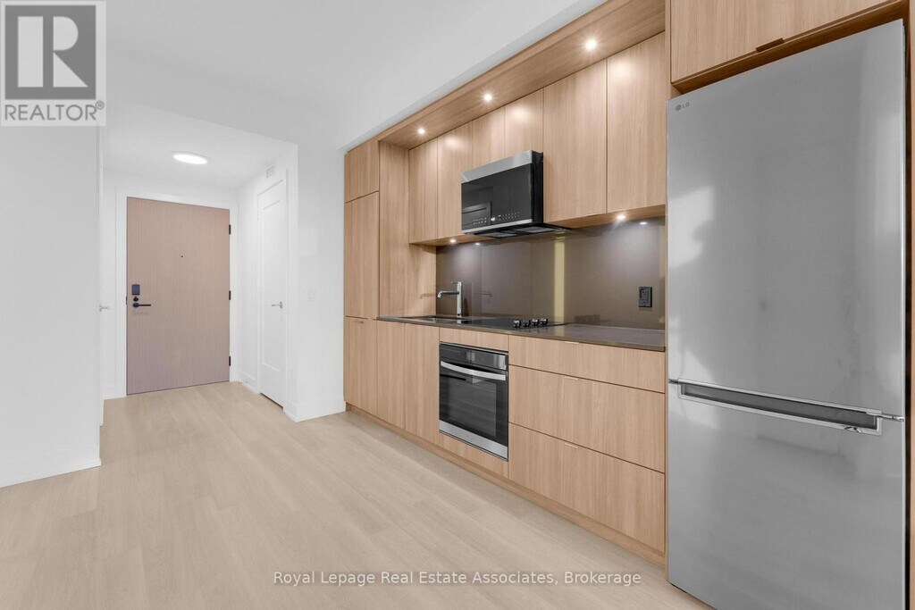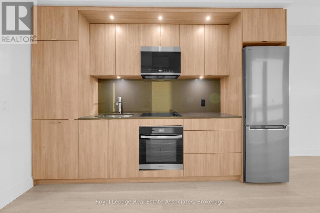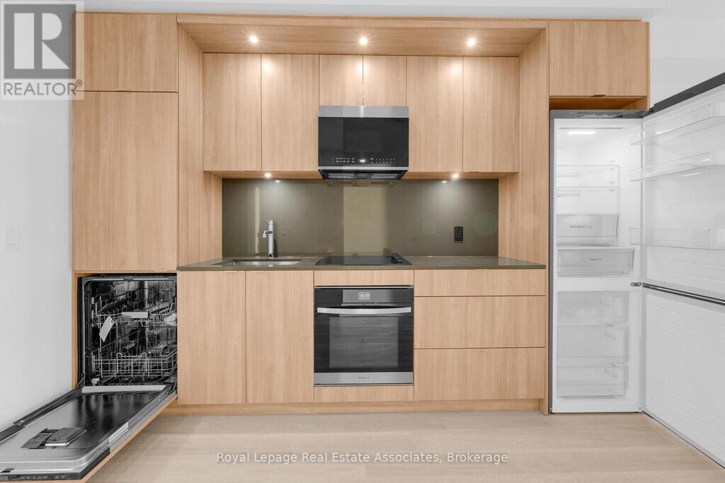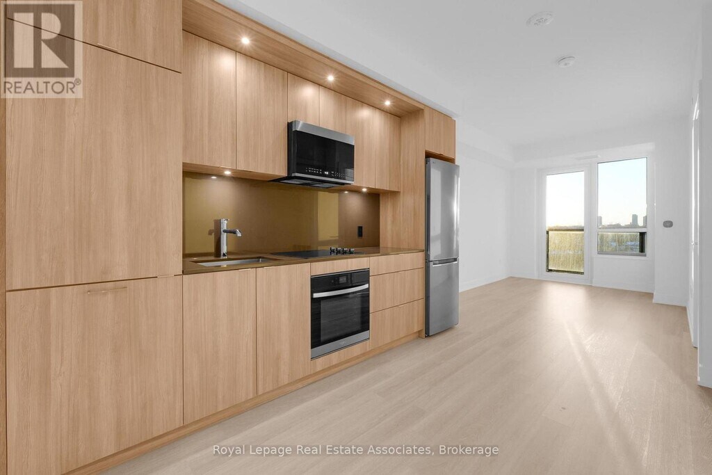 Welcome to Westerly 2 by Tridel,a modern condominium community offering thoughtfully designed living in the heart of Islington-City Centre West. This bright 1-bedroom plus den suite features 599 sq. ft. of well-planned interior space with clean contemporary finishes and an open-concept layout suited to comfortable everyday living. The kitchen is equipped with full-height cabinetry,integrated stainless steel appliances,quartz countertops,and under-cabinet lighting. It flows seamlessly into the combined living and dining area,where wide-plank flooring and large windows create a welcoming,light-filled atmosphere. A walk-out from the living room extends your living space outdoors onto a private balcony. The bedroom includes a full-height window and ample closet space,while the generous den provides the flexibility for a home office or additional work area. The modern 4-piece bathroom features contemporary tilework and a sleek vanity. In-suite laundry is tucked neatly into a dedicated closet,and the suite includes one parking space. Residents enjoy access to a fitness centre,party and meeting rooms,guest suites,and 24-hour concierge. Ideally located steps from Islington Station,parks,grocery stores,and community conveniences,this suite offers a comfortable blend of modern living and everyday practicality in a well-connected Etobicoke neighbourhood. (id:52069) ID#: 1968379