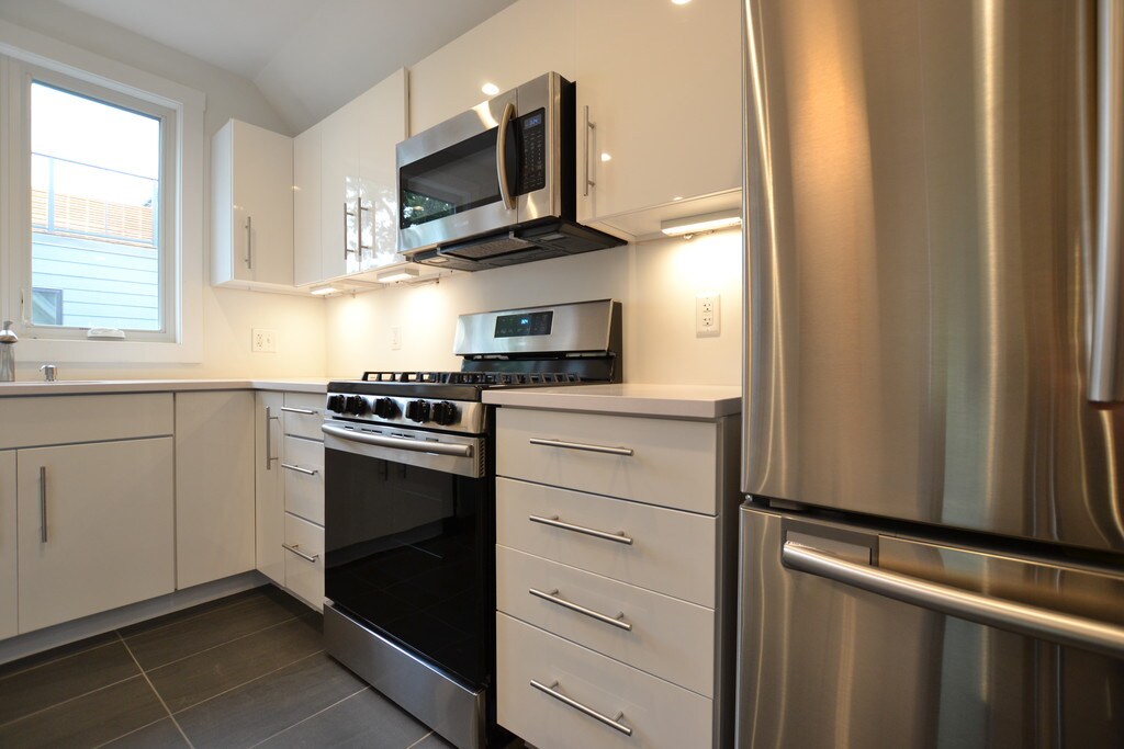 This BEAUTIFUL gut renovated 3 bed, 2 bath in Allston features all the amenities one needs to live comfortably in the city. The modern kitchen w/ stainless-steel appliances, white silestone counter-tops, and an island open to the living/dining area makes entertaining fairly easy. Bamboo flooring, Italian porcelain tiles, custom cabinets, recessed lighting, new roof, in-unit laundry, it just goes on and on. Not to mention a private balcony and the 2 off-street parking spaces included. Conveniently located steps to Harvard Business School, stadium, and Allston Campus. The Mass Pike, Storrow Drive, & Downtown Boston are all within reach. The commuter rail nearby makes commuting even more convenient. Don't Miss out! (One Month's Brokerage Fee Applies)